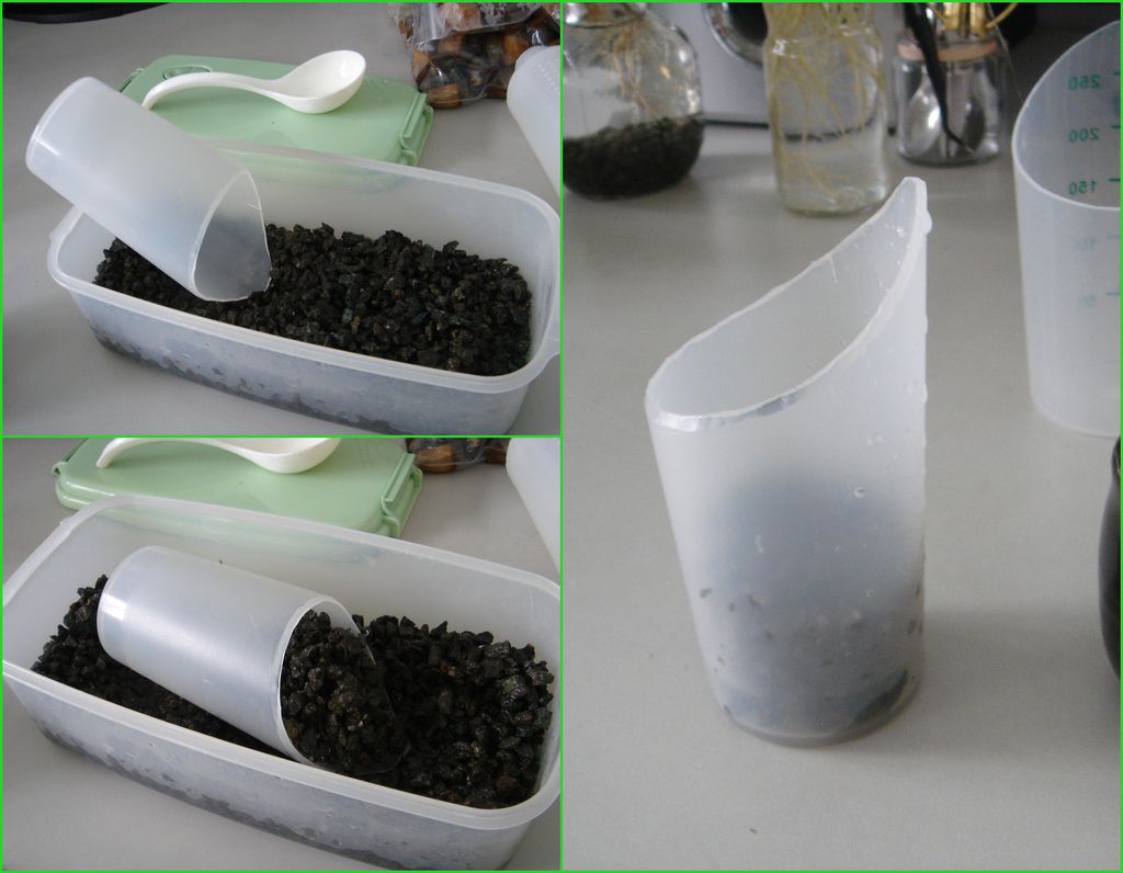 之前,還沒有看到這項"盛土器"工具時,在做水耕種子組合盆栽時,都是用小湯匙,一小匙~一小匙的填入,花的時間比較長,而且麥飯石常掉到外面,事後要收拾,就要撿好多小石頭
