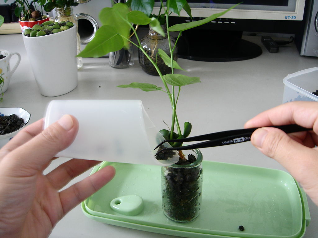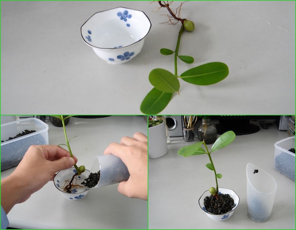 ▼盛土器填入小瓶口(水黃皮移盆到小瓶器)
