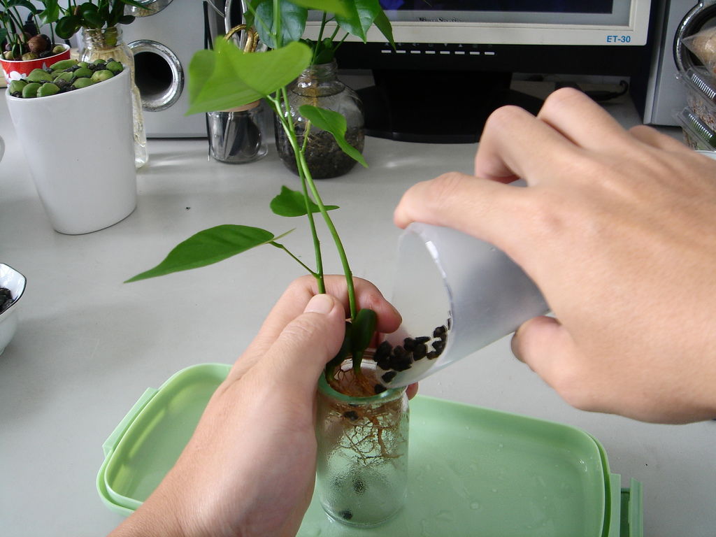 接下來是較小的瓶器,也沒問題,只是要小心一點,倒慢一點,預防小石頭掉滿地,可以在下面墊個東西,掉出來比較好收拾。裝填時,一手固定植物,一手將石頭倒入瓶子。
