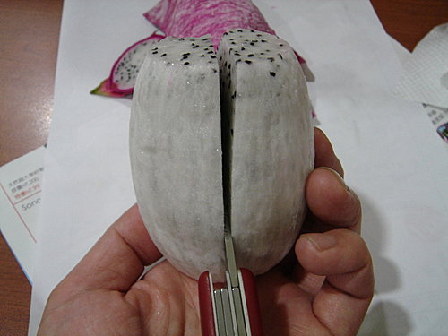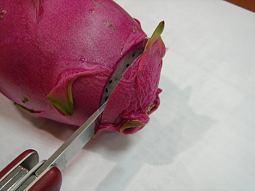 ▼步驟三:從火龍果的肚子(從前到後),輕輕劃一切,只要刀子切過皮的厚度就可以了