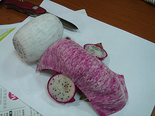 火龍果又稱紅龍果,它是仙人掌科三角柱屬或蛇鞭柱屬植物,果實呈橢圓形,外觀紅色,有綠色的圓角三角形突出物,依果實和果肉顏色可分為三大類,紅皮白肉,也就是最常見到的那種,俗稱火龍果,又名白仙蜜果;第二種是紅皮紅肉,俗稱紅龍果,又名紅仙蜜果,最後一種是黃皮白肉的品種,俗稱黃龍果,又名黃仙蜜果(第3種我沒看過