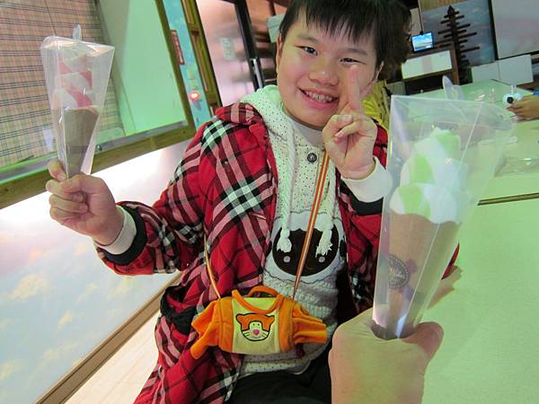 有趣毛巾DIY,是來這裡的目的之一,要讓小朋友體驗一下毛巾DIY的樂趣,因為當時做DIY的人不多,店員告知2個人就可以教學做DIY,於是我和我女兒一組,做的是"毛巾甜筒",而我兒子及太太一組,做的是"毛巾可愛狗",都有專人教學,完成的作品,當然可以帶回家當紀念品囉~