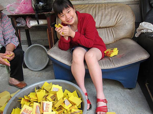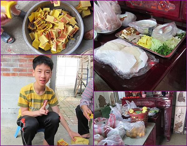 祭祖拜拜的食材,最重要的是潤餅,這麼多好料都出自我媽媽的好手藝,我們只是幫忙拿回古厝拜拜而已,到了古厝,小朋友的任務之一,就是幫忙摺金紙,我記憶中,我小時候也都是這樣,剛開始不會摺,一張一張拿起來對摺,慢又沒效率,但長輩們總是不在意,因為邊做邊聊天,燒香拜拜要一段時間,大家慢慢摺,摺好剛好可以燒紙錢。