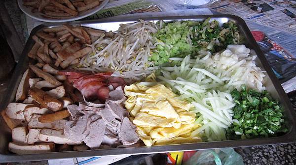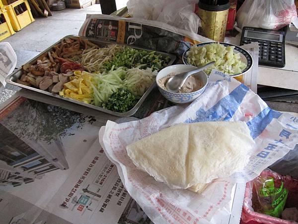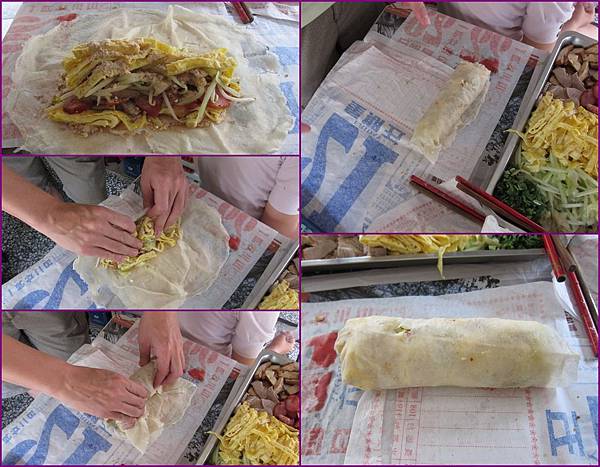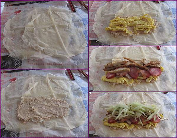 包潤餅過程~先舖1~2張潤餅皮,放入花生及糖粉的混合粉,再依順放入蛋皮絲、香腸片、肉片、魚黑輪(台語~不會翻成國語),再加入蔬菜,有豆芽菜、高麗菜、涼瓜(台語叫刺瓜),我最後還會舖一點蛋皮(喜歡再多加點) ,最後撒上一層花生糖粉,就可以包起來囉~