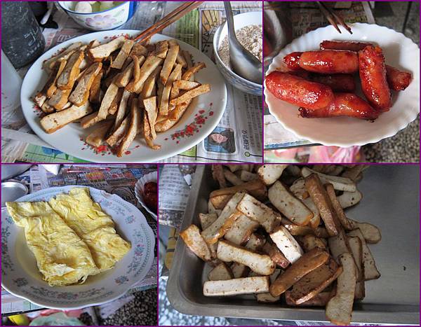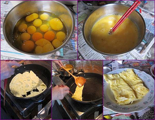 潤餅的食材,這麼多好料都是出自我媽媽的好手藝,而我們就只能幫點小忙,像打打蛋,混合花生粉和糖粉...等,我們最終的任務,就是自己包自己想吃的食物,包成潤餅的樣子~"再吃到肚子裡" 。