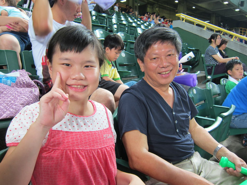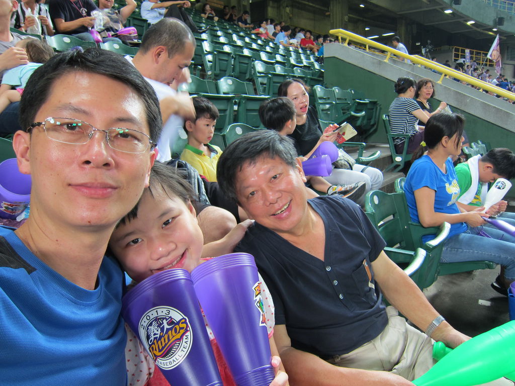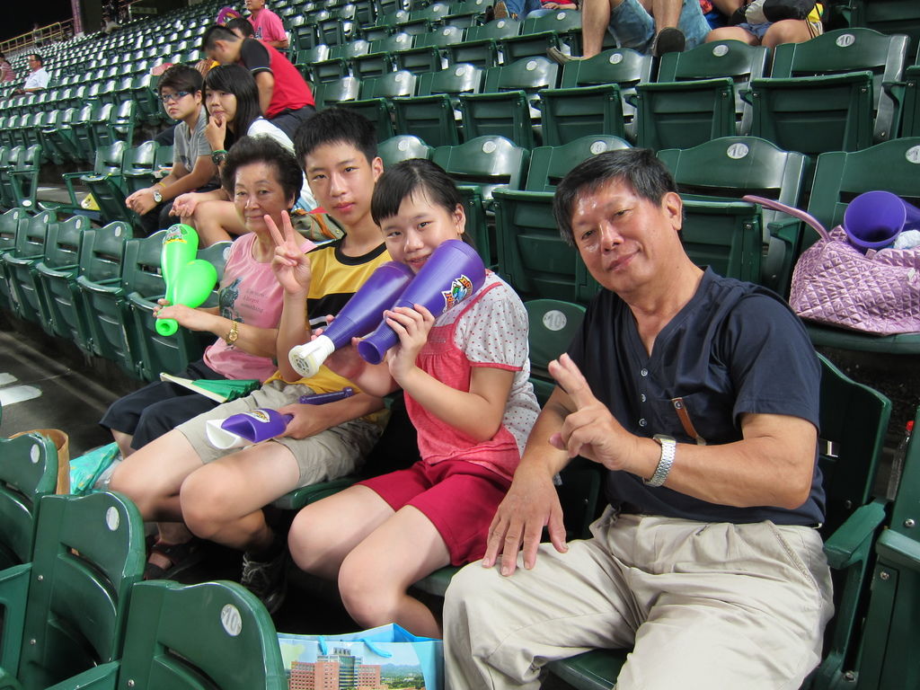 去年到球場好幾場,也有分別帶我爸爸、媽媽(小朋友的阿公、阿嬤)到球場看球,記得帶我爸來的那一場,犀牛輸得很慘~輸了十幾分,我爸都一直說"只要他看球,就會輸"~好在這次來看球,犀牛爭氣,在3~4局一口氣打了7分,看得大家都好開心,一直敲拉拉棒,安打啦~安打~全壘打~全壘打,一直喊~