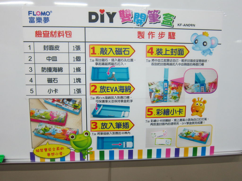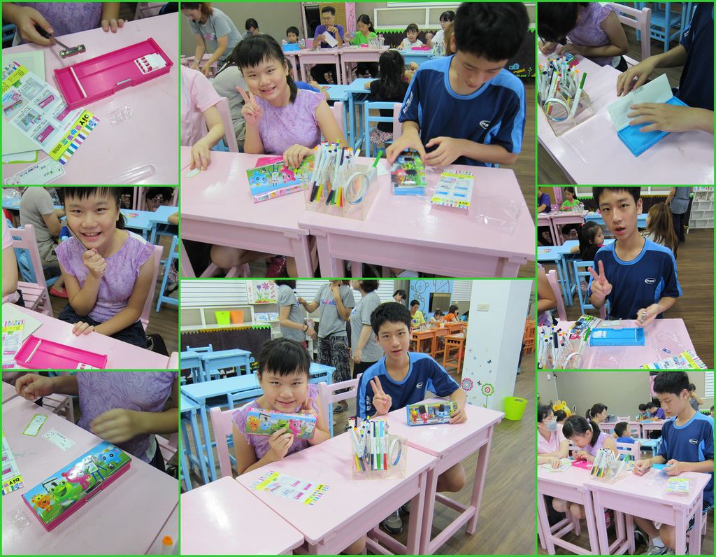 DIY活動是製作雙開鉛筆盒,材料要自己花錢買,製作還滿簡單的,小朋友一個人一個鉛筆盒,DIY很快就完成了,只是回家裝筆才發現,這個鉛筆盒,太淺了,一般的細的鉛筆是可以放進去,但胖一個的自動鉛筆或原子筆就放不進去了,工廠應該做大一點(深一點)才對。