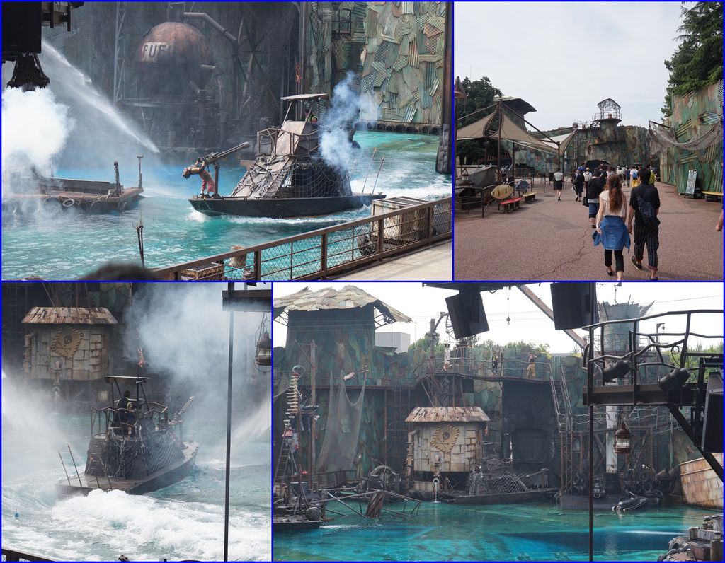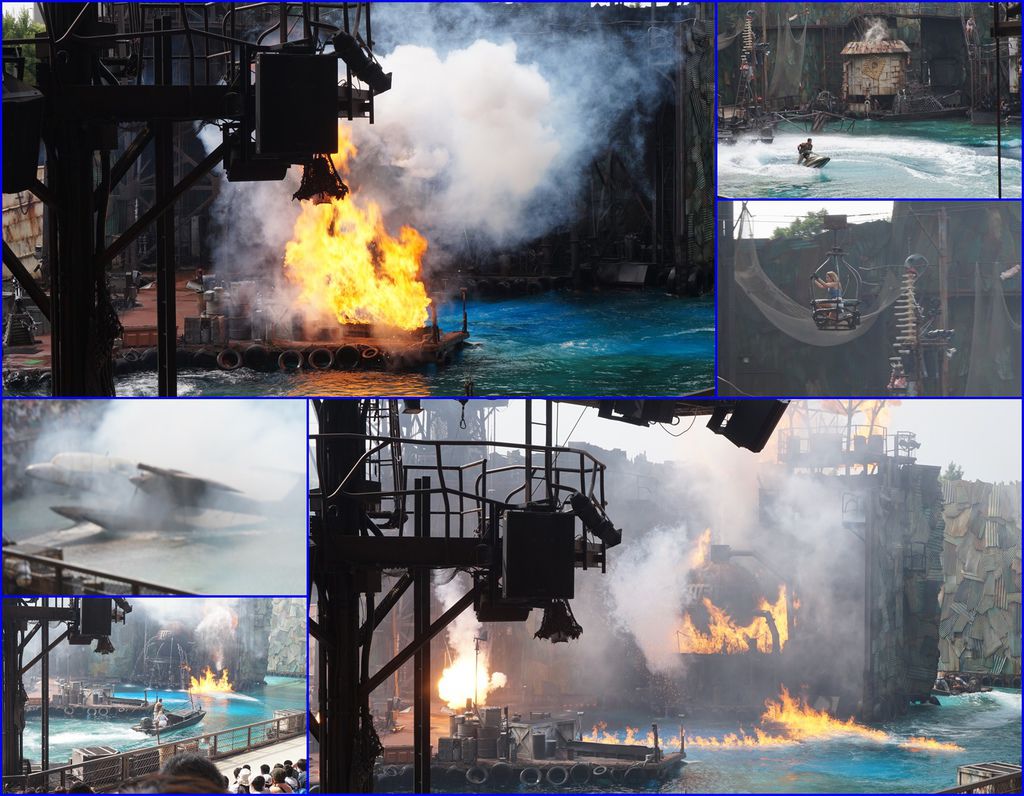 接下來原本要到侏儸紀公園玩,但這一陣子剛好在整修,所以我們沒能玩到,只好走到水世界,剛好趕上表演開始,一進場,表演一直都沒有冷場,壞人、好人打來打去,有水上摩托車、快艇在水上飛快來回,最後還有一台飛機飛進來,很多人都嚇了一跳,另外,不時還會有水噴到觀眾席,做在前面的人都被淋溼了~到最後來個超級大爆破,火很大,但一下子就控制下來,真的很刺激。