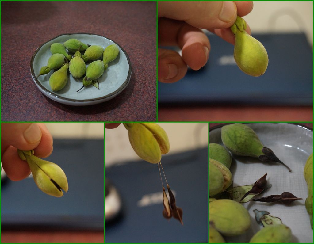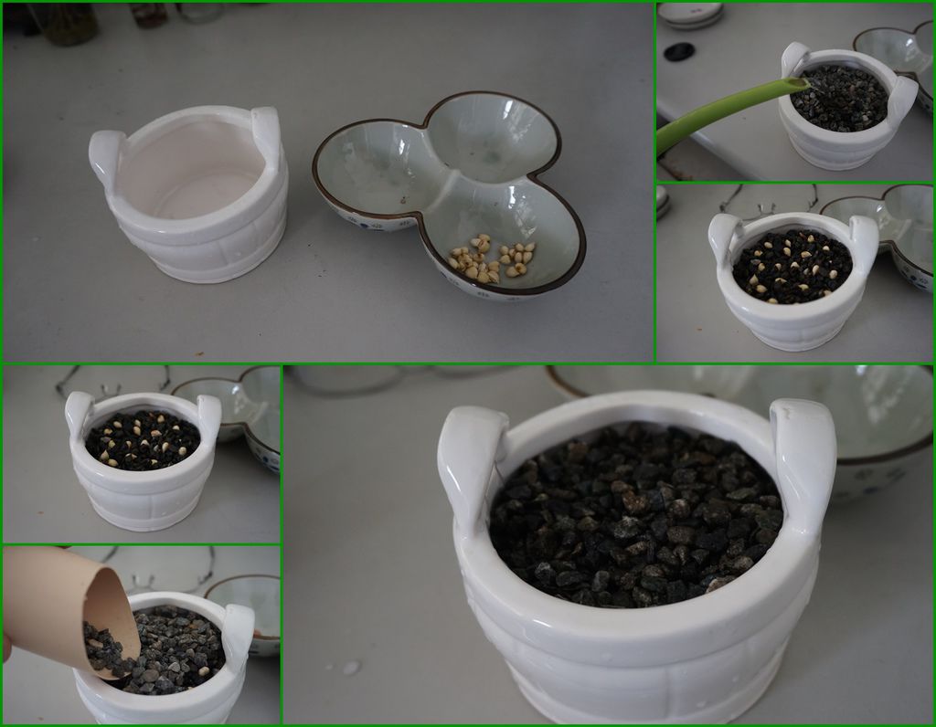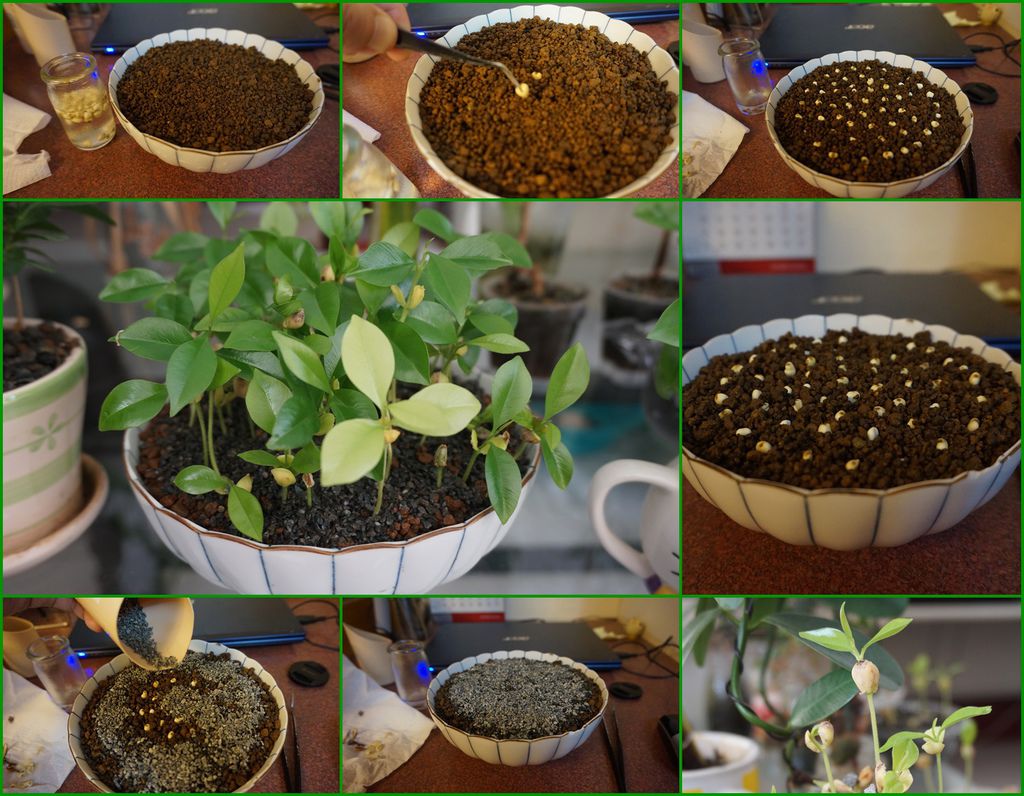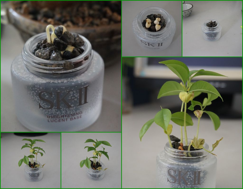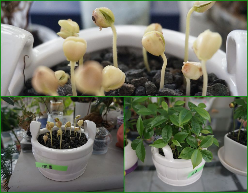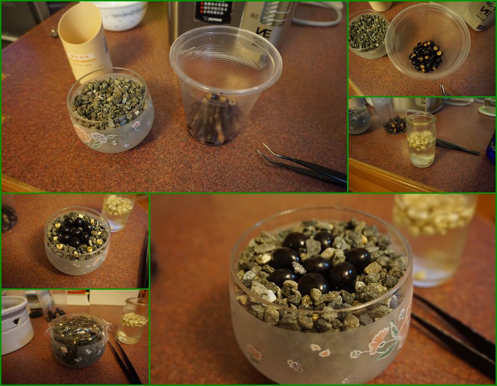 來複習一下沉香種子盆栽的種法:1.打開果莢 2.取出黑色硬殼的種子 3.種子用大拇指與食指一壓,裂縫一開,播開硬殼,取出裡面的種仁 4.種子泡水約2~4小時,就可以開始種植了 5.種植時將種子的白白尖尖部位朝下插入土裡或麥飯石裡 6.噴水或澆水,讓土或石頭全溼,若澆水時,水位不可以泡到水 7.蓋上保鮮膜保溼 8.等待發芽,過程中不用再澆水,發芽後再將保鮮膜移除 9.土乾再加水就可以了。