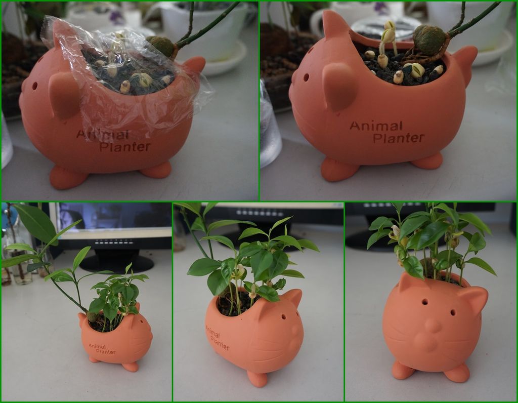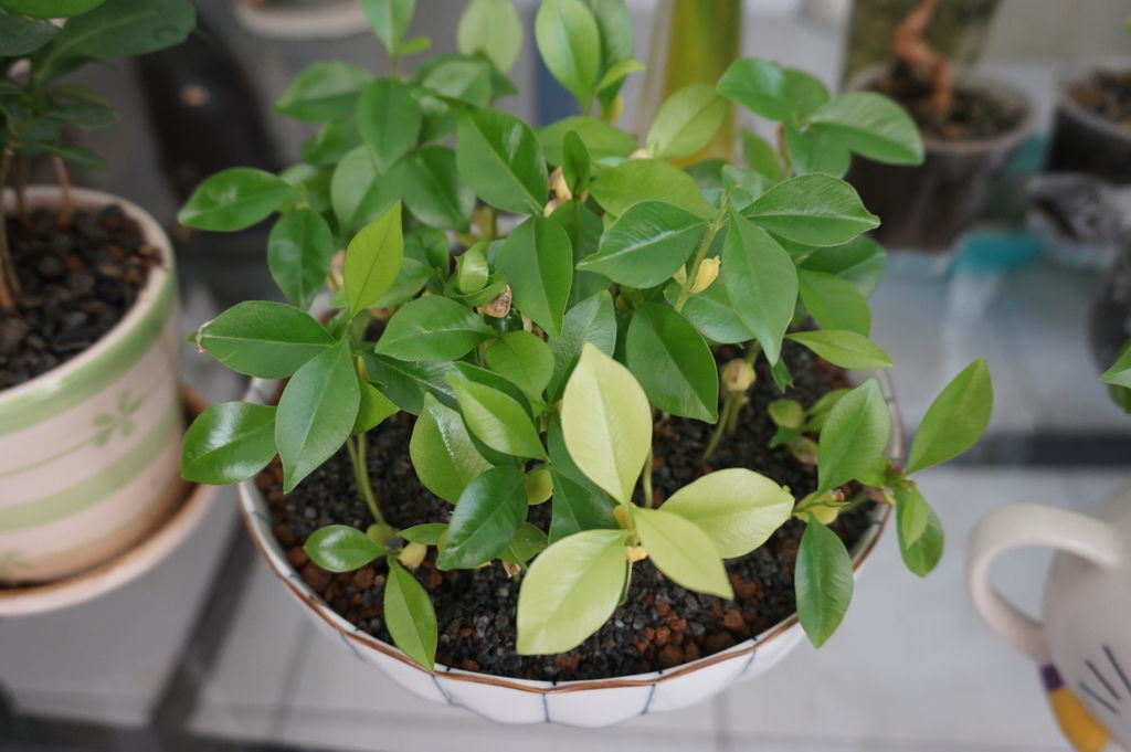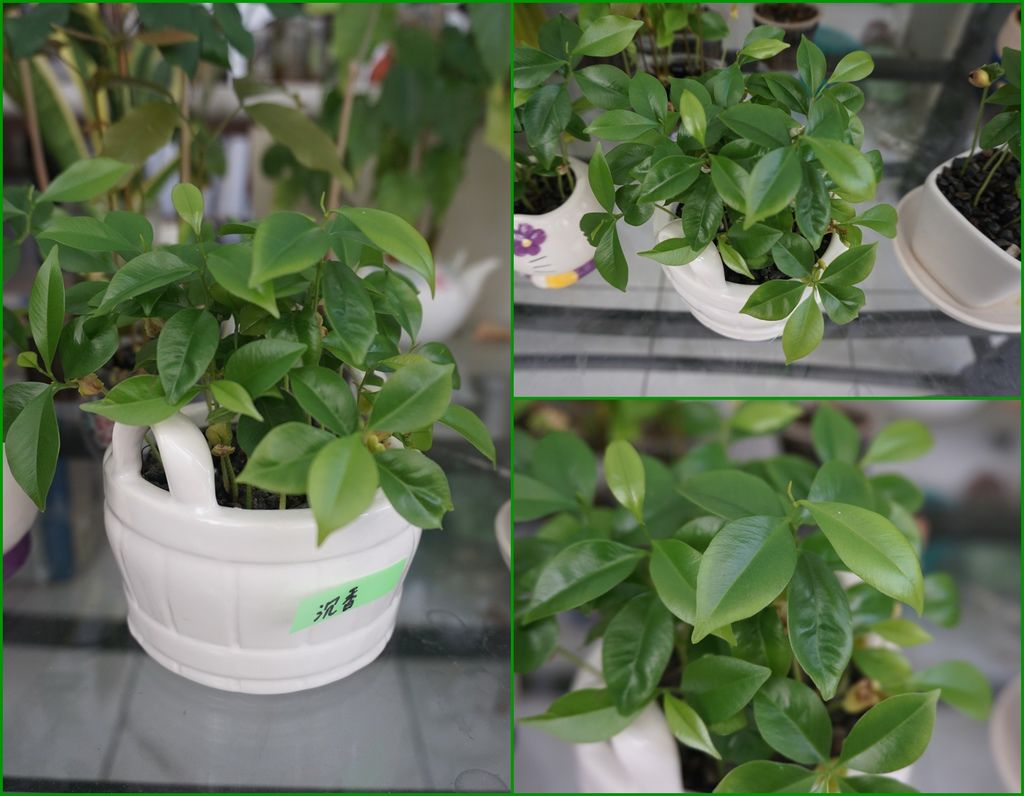 以下這盆是柚子+沉香的組合盆栽,柚子是去年中秋吃柚子時,所種的柚子,隨便抽一棵來與沉香搭配,想做出不一樣的效果,但最後,沉香成長過茂盛,柚子被埋沒不見了,不過整盆還是看起來綠油油的~