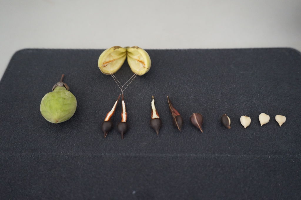 沉香的果實很特別,打開果實,裡面的種子大部份都有2顆,而且有條白色的線連著,不會馬上掉出來,很有趣,也很特別,而且它有個特性就是要越早種越好(新鮮種),發芽率越好,越後面的失敗率越高,雖然可以放冰箱保鮮,但也不能撐很久。