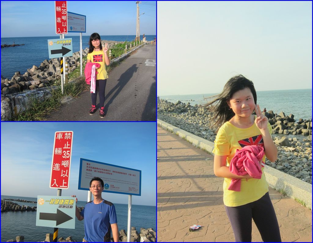 就這樣,在國小操場鳴笛後,一大群人就往外跑,我們是"慢"、"走"組,所以不用搶先,慢慢的跑,跑累了就用走的。這回我兒子體力有好一點,全程都用跑的,而我和我女兒慢慢路,一次跑到海邊就開始休息用走的,就這樣慢慢的走回終點,雖然用走的,但到最後100公尺,卻"假裝" 一下,跑進終點站,還領了一頂紀念帽,還有礦泉水。