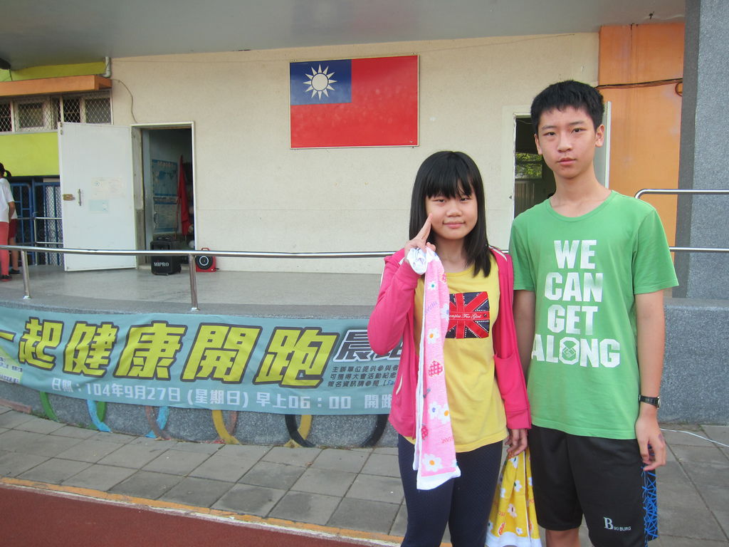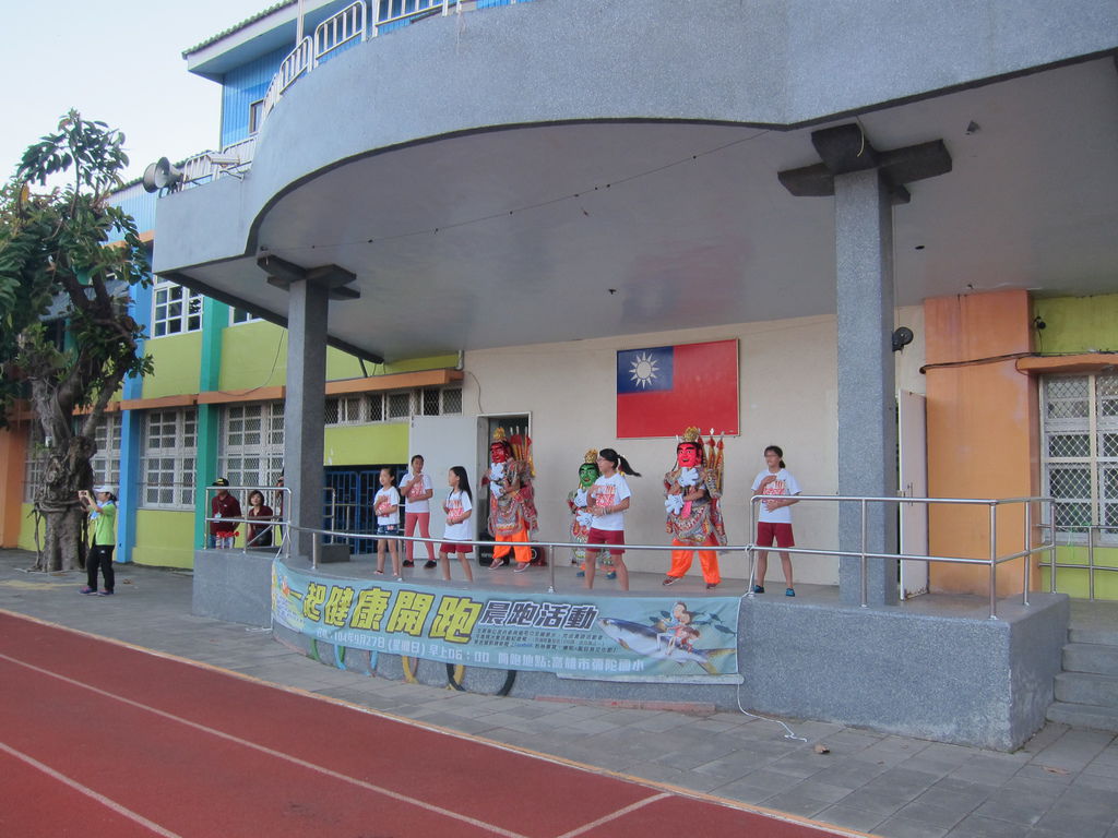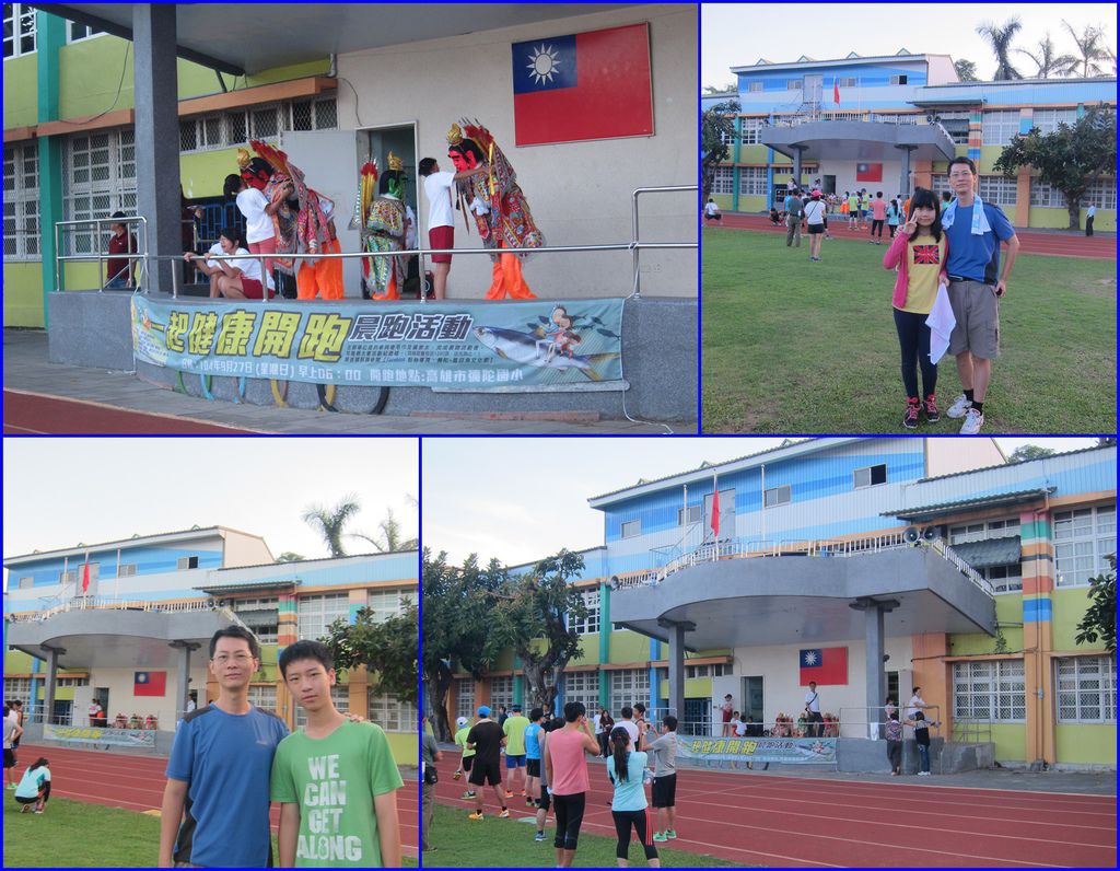 一大清早5點多就起床,2個小朋友都面有難色,都說今天難得假日,很想睡久一點,但我覺得一年才一次路跑活動,當然要參加,雖然剛開始有點睏,但活動一下,精神就來了。我們大約6點就到國小的操場集合報到,每人都領了一條毛巾,之後,我們就在操場活動起來,也順便拍拍照,接下來是長官講話,路跑前當然是要先暖身一下,這回是由國小的三太子,帶大家做暖身操,跳得很熱鬧。