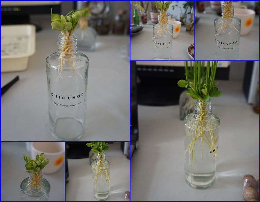 另一盆水耕的柚子種子盆栽,是使用已經用完的"化妝瓶"空瓶,回收又可以種上一盆柚子種子盆栽。