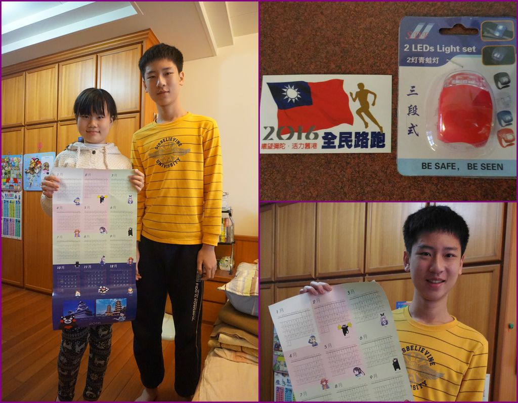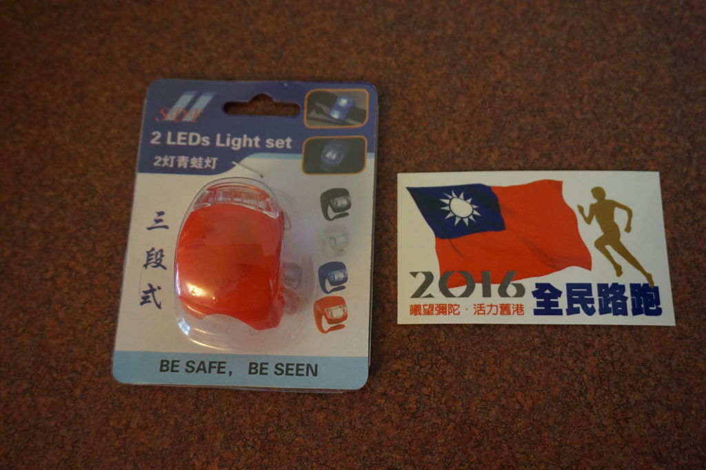 完成路跑是有贈送小禮物的,我家哥哥跑比較前面,有拿到,是一個青蛙燈,是LED燈,可以掛在單車上的夜燈,還有一張高雄市政府發的年曆。而我和妹妹邊跑邊走,回到終點都很晚了,禮物都發完了,所以沒拿到。