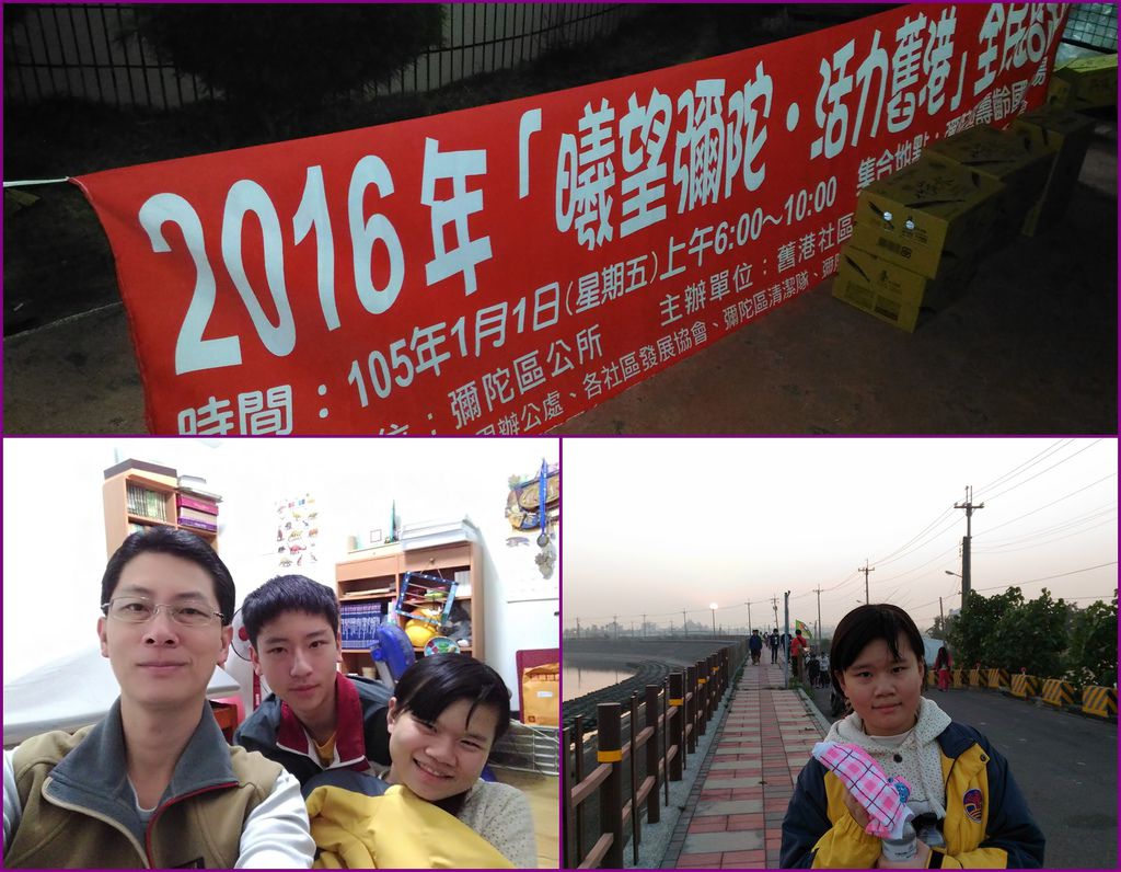 2016年元旦做什麼呢?當然是要參加"路跑活動",一大清早5點多就起床,拉著2個小朋友一起到國小參加路跑活動,今年元旦區公所沒有主辦路跑活動,反而是社區"舊港里"主辦,主題叫做"2016年曦望彌陀.活力舊港",地點在彌陀壽齡國小,路線與以往不太一樣,但同樣是跑到彌陀海邊,再跑回原出發地點,沿路都是漁溫、海提。