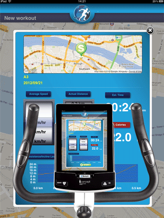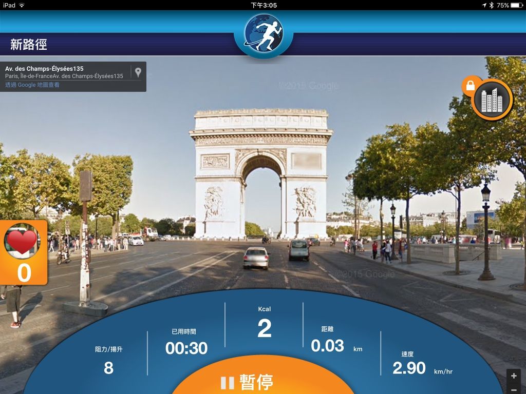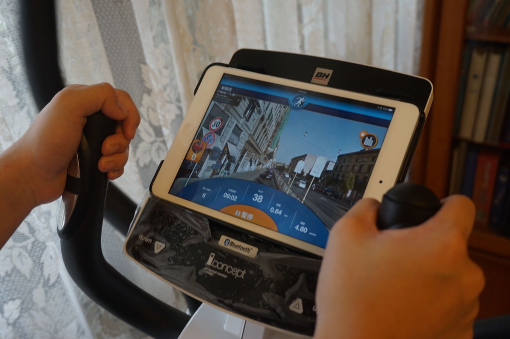 這台橢圓機可以和我家的iPad做藍芽連線,經過下載專屬App~"Run on Earth",可以結合Google Maps街景,也就是可以先設定Google地圖裡的地點,全世界只要有Google Map的地方都可以,找到地點就可以開始走,可以邊走邊看當地的街景,而且更有趣的是,橢圓機會隨著當地的坡度變化,腳踏的重量也會隨之變化,也就是如果走的路是上坡,就會感覺變重(共有24段),如果是爬山,就會真的變很重,要花不少力氣,但如果是下坡,就會變很很清鬆。