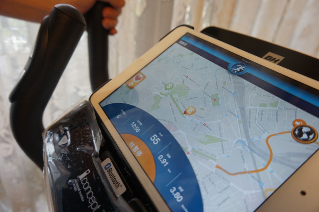 這台BH橢圓機有不少特色吸引我們,第一當然是試踩很順,又可以有很多種模式可以設定使用,但有個特色是它具有藍芽功能,可以和行動裝置,像手機、平板(iOS或Android系統)都可以連線,而且有App可以使用,最主要的是有一款"Run on Earth"的健身App,可以結合Google Maps街景,在踩橢圓機的同時,還可以看到Google Map街景,但不是像電視影片有連續畫面,只能走一段路,畫面變動一下而已,但當下已經很吸引人了。