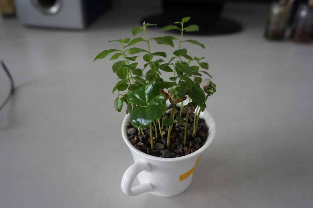 ▼種在小盆器後面的咖啡小苗也展葉了(2016/4/24拍攝)