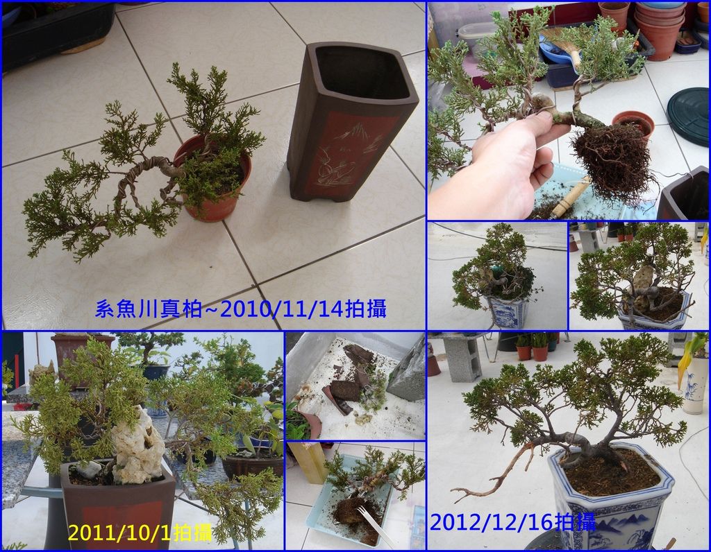最後我找一棵我培養了6年的"系魚川真柏",這棵是我6年前(2010年)在岡山籮筐會買的系魚川真柏,應該是我的第一棵真柏,是5吋塑膠盆,原本就有一點彎曲,應該算是半素材,經過換盆改植,變成懸崖式的盆栽,後來又遇到一次強風,整盆摔落破盆,所以又強迫改植,直到今年的2月又再次的改盆,從小小一棵,葉片稀疏,到現在的茂盛,都是用時間慢慢培育而成,一點一滴就像我的部落格一樣,慢慢的記錄盆栽及生活點點滴滴,持續的成長中。