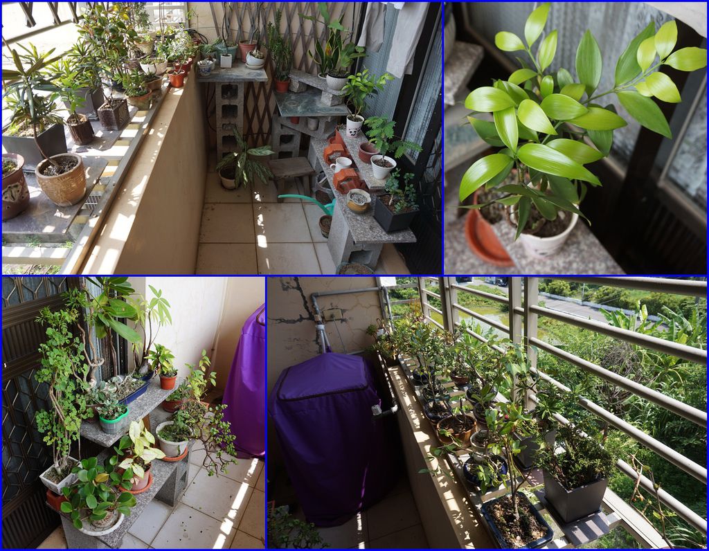 我家陽台現在的樣子,感覺好像沒落了一點,盆栽數量有比以前少一點,主要因為只要盆栽有點生病或蟲害,我就會拿到頂樓處理及培植,之後我就沒有將它拿下來陽台,但有時候還是會拿個幾盆下來擺在陽台,另外一個原因是陽台的日照問題,很多盆栽都是喜歡全日照,半日照的陽台就長不好,所以只有適應半日照的盆栽,才會放在陽台。