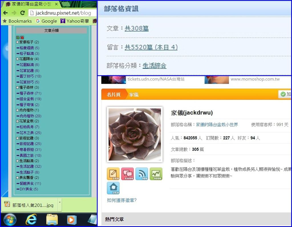 家儀的陽台盆栽小世界~我的文章數量從去年2015/5/20的256篇到今日(2015/5/20)的305篇,共增加了49篇,數量不多,這是因為我"固定"每週PO一篇文章的結果。而人氣指數,在我格子也是一個重點,去年5/20的累積人氣是441,534人次,到現在842,055人次,足足多了40萬人次,每天大約都有1千多人次造訪。