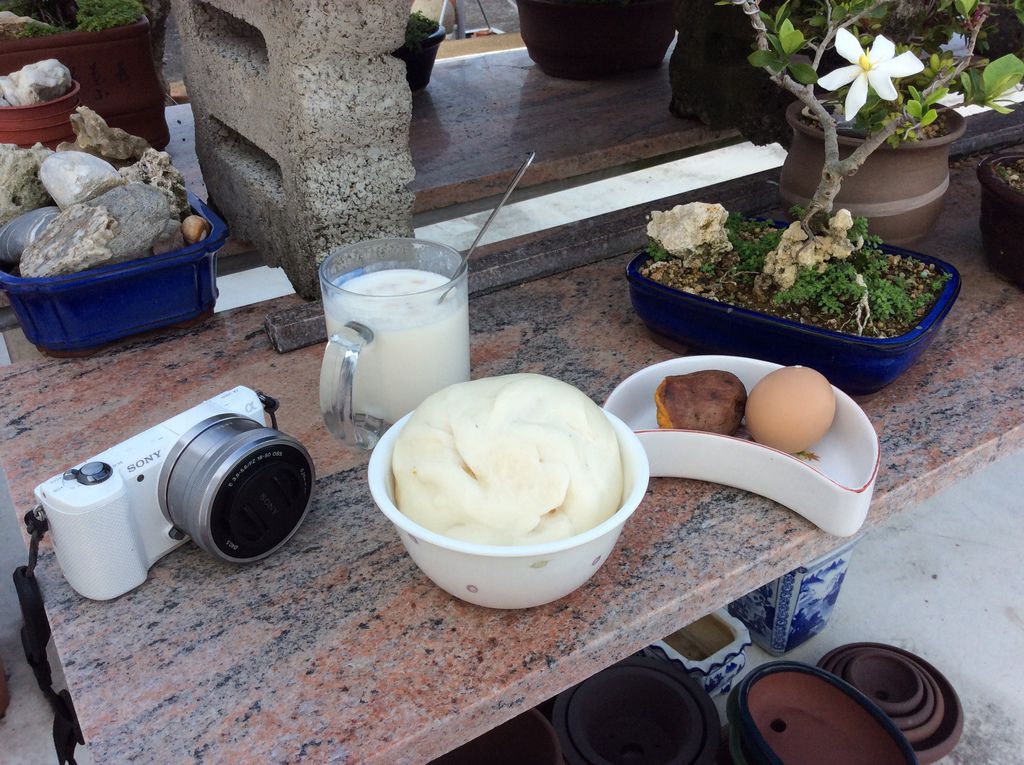 有時候在假日的早上,我會一大早就到頂樓打掃、整理花花草草,但事前總會先填飽肚子,於是就有以下這張在頂樓吃早餐的照片,一旁還有照相機,這就是要邊做邊拍照,留下整理花草的點點滴滴照片。