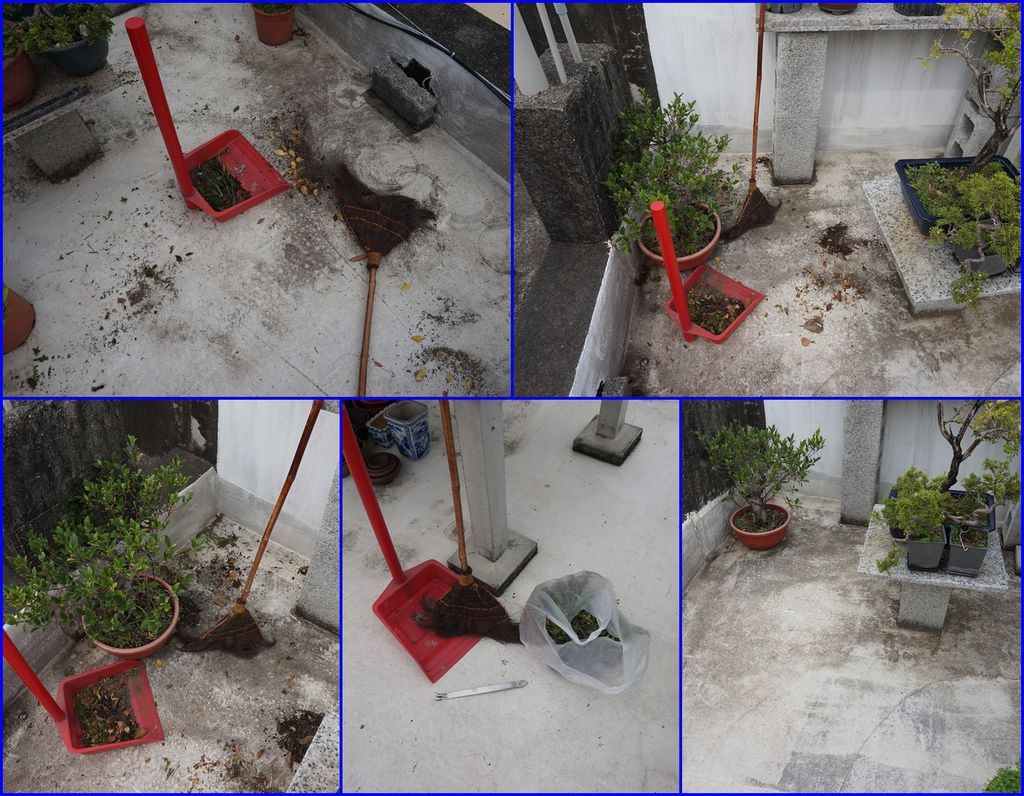 為了有一個乾淨、整潔的花園,打掃是必要的,在頂樓花草盆栽愈來愈多,落葉、落土或雜草,都很多,打掃就是一個重點,雖然不用每天打掃,但只要髒了、落葉多了,就要好好的打掃一番,尤其雨季來臨前,頂樓的排水孔清掃就很重要,堵住不通就很麻煩,所以都要常常注意排水孔,不可以雜貨堵住,在東西就要馬上掃除。
