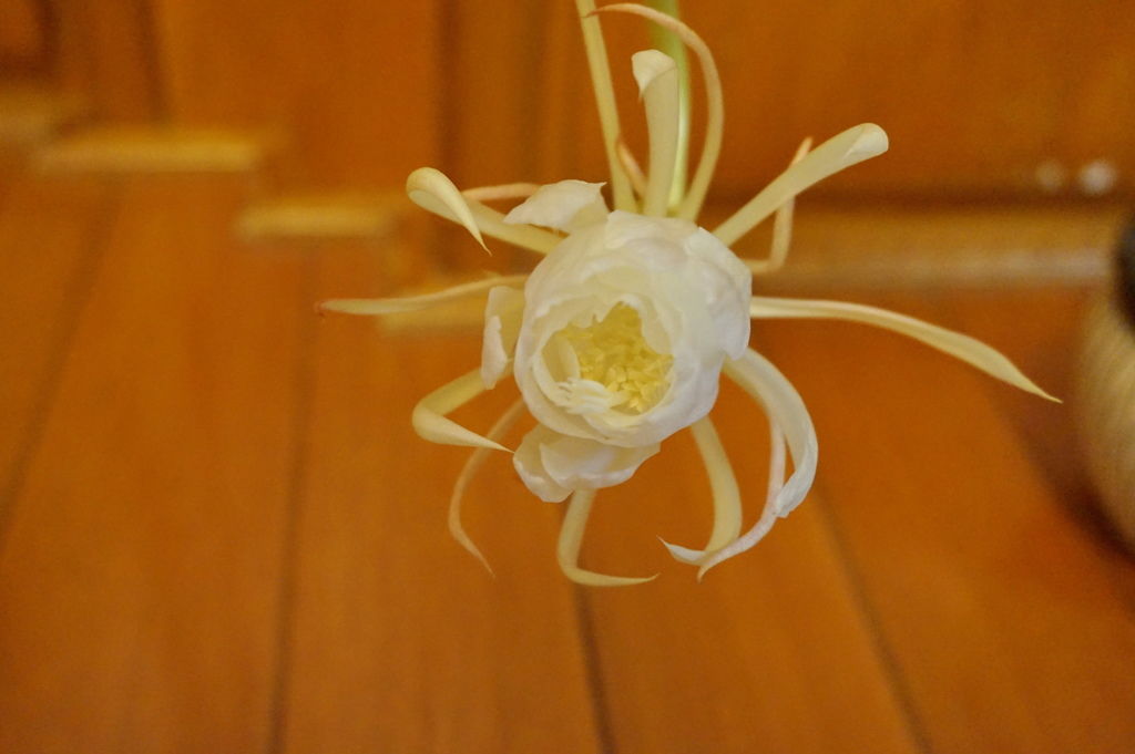 在陽台看到曇花開花,除了在陽台一直拍照,又將這盆栽拿到房間,好好的欣賞一番,並且與家人分享,看看難得一見的曇花花朵,雖然沒有看到它全部花開綻放的樣子(全開好像要到三更半夜),但能看到它的身影,我們全家都好開心。