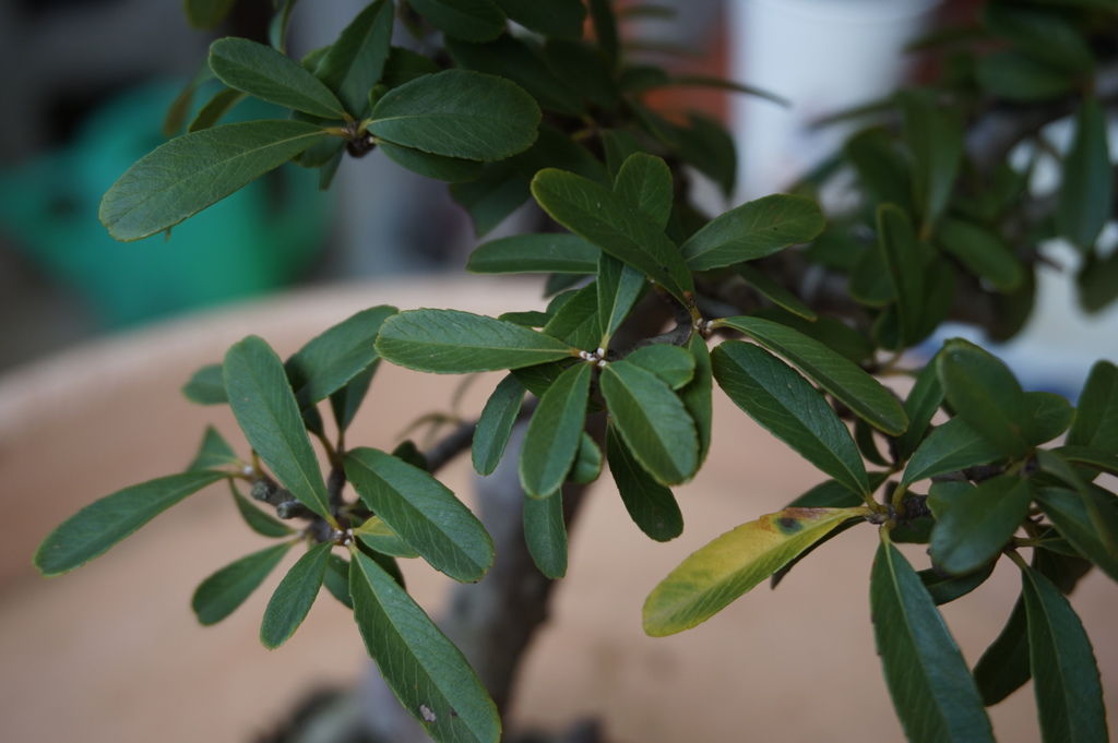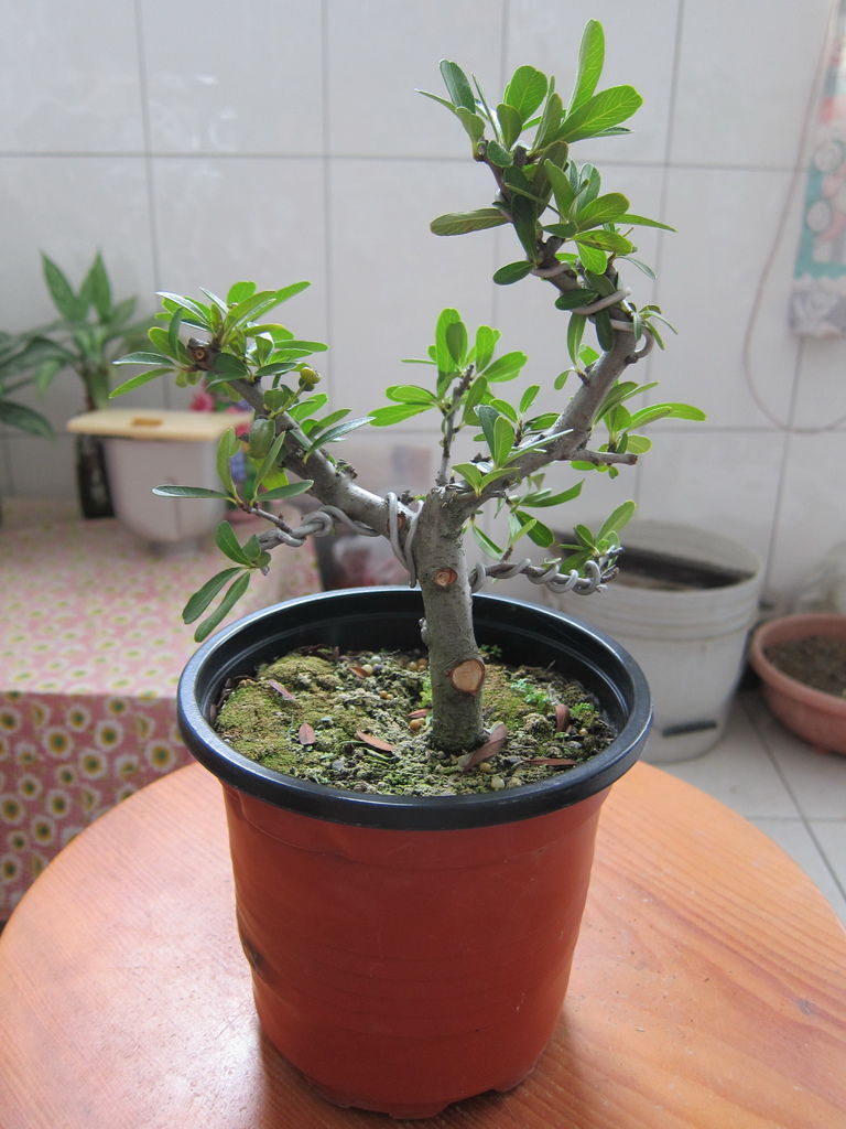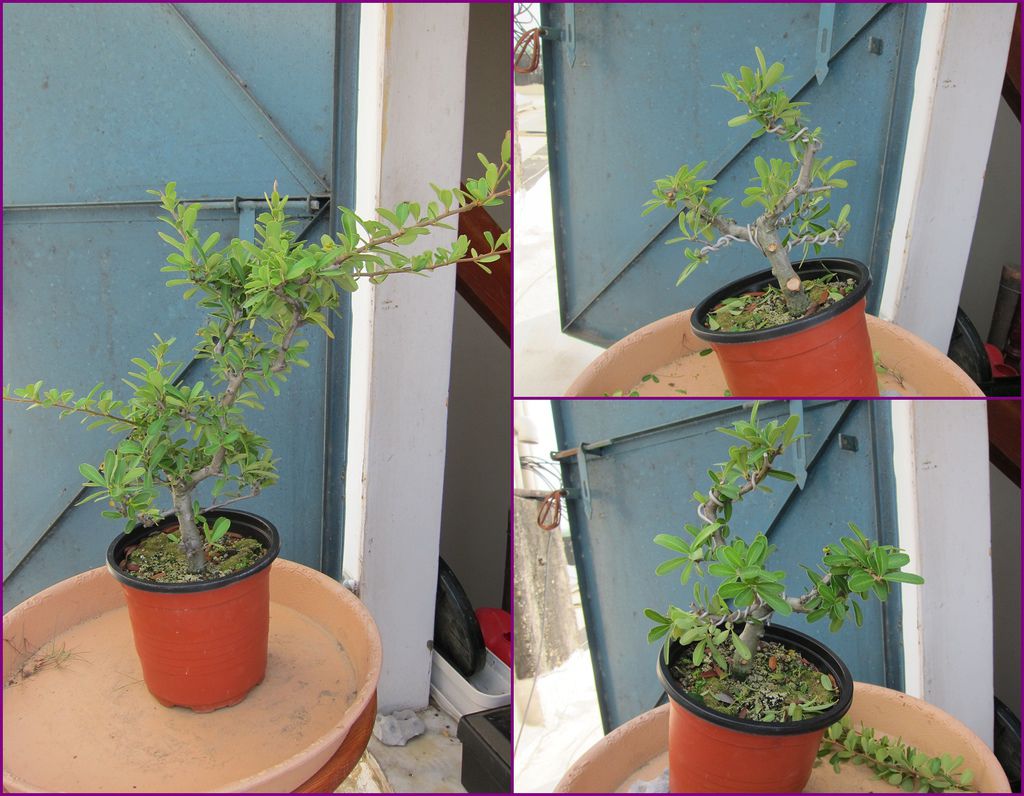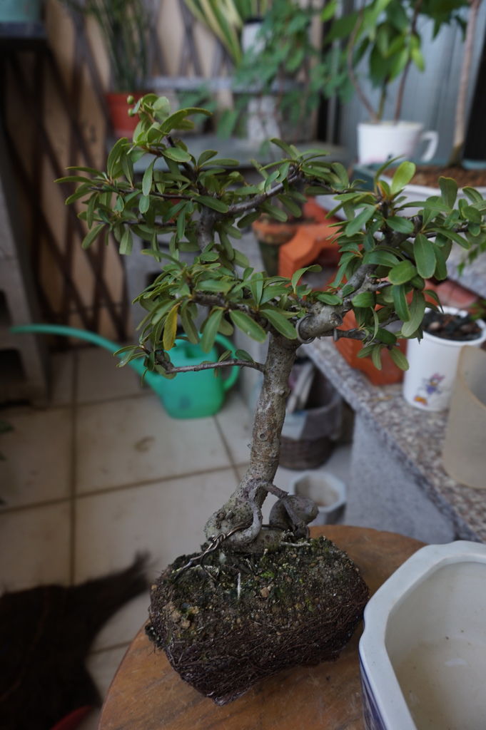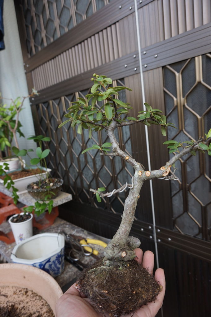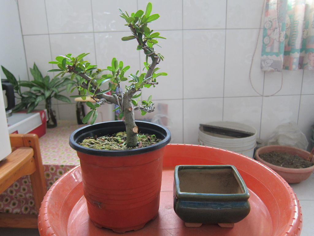 在幾年前一次岡山籮筐會時(2013年10月19日),買了一盆"狀元紅"素材,所謂"素材"就是沒有什麼型,只有小小的修剪,這類的素材買回家就是要自己DIY,如果換大盆,任由它成長,就會愈來愈大棵,有可能變成大樹,當然我家沒這空間,所以儘量讓它變小,小小有型的盆栽,可以拿在手上觀賞,也比較好搬移及整理。以下是我的"狀元紅"在買回家後一年,將素材變成小盆栽的過程,而且今年又再換一次盆,這回換盆是因為它被風吹落而破盆,所以順勢就將它換換盆。
