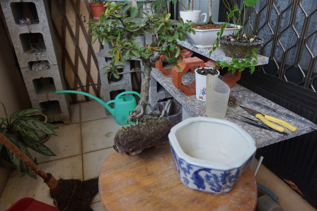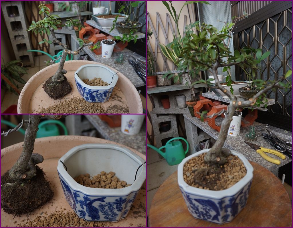 狀元紅素材買回家後,第一次要改變它,就要好好的找"角度"及"剪定",找角度就是要找到它的"正面",種下去的角度要擺什麼樣才好看,要如何剪才會像小盆栽,其實這些都是看個人喜好,有些高手剪一剪、修一修,就能變得很好看,而我當時只是憑感覺就剪下去了。