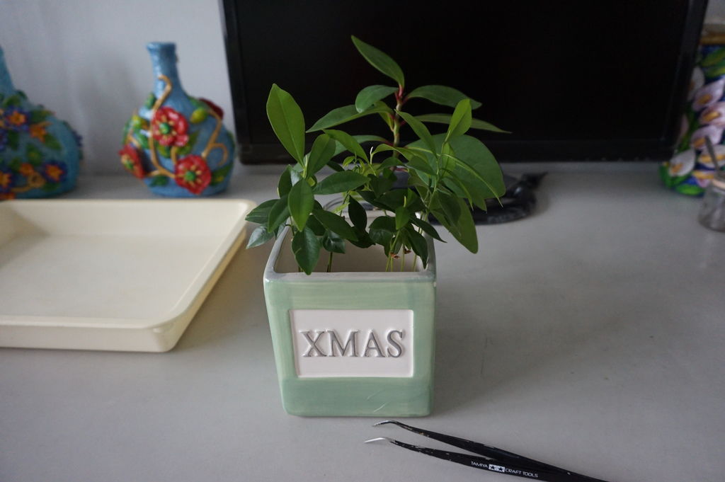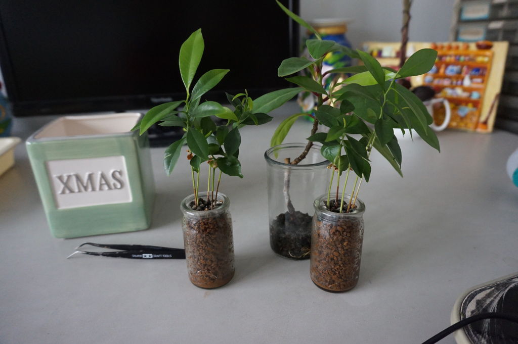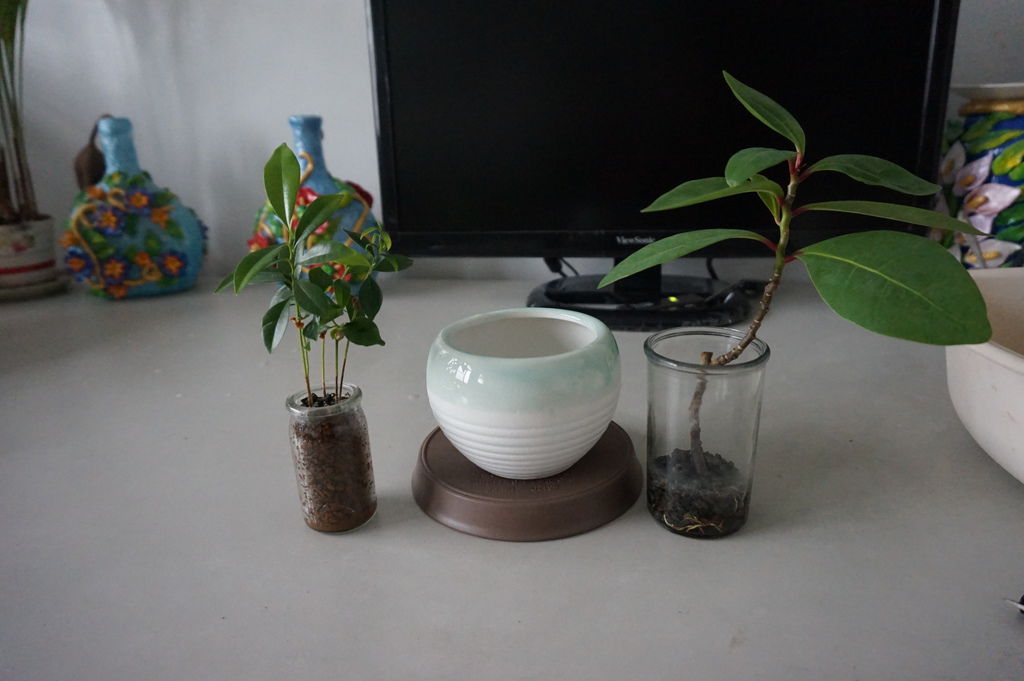 ▼組合盆栽的素材~有沉香小苗、插枝存活的棋盤腳、盆器