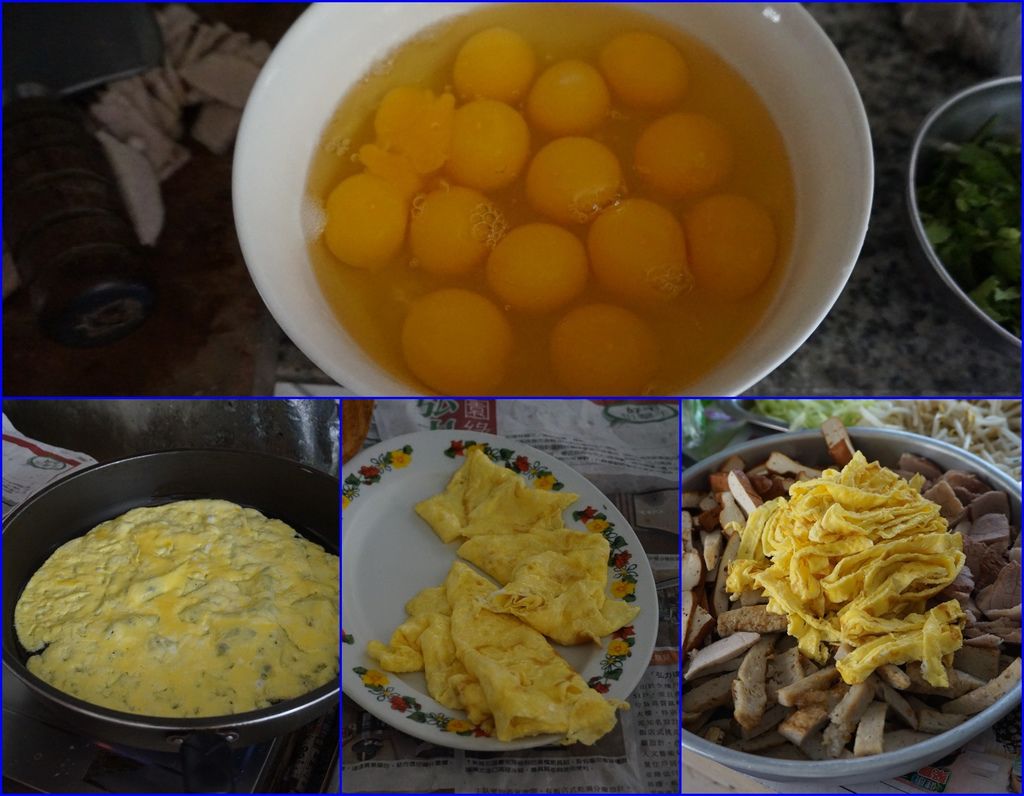 這潤餅材料不少,要準備這麼多,很花時間,但我媽媽總是很厲害的一一準備讓我們吃,真是辛若。這回,這麼多材料中,我只有幫忙到"煎蛋皮",方法還滿簡單的,就把蛋汁淋到鍋子,轉一下,平均受熱蛋皮,感覺半熟就可以捲折起來,這樣就好了。