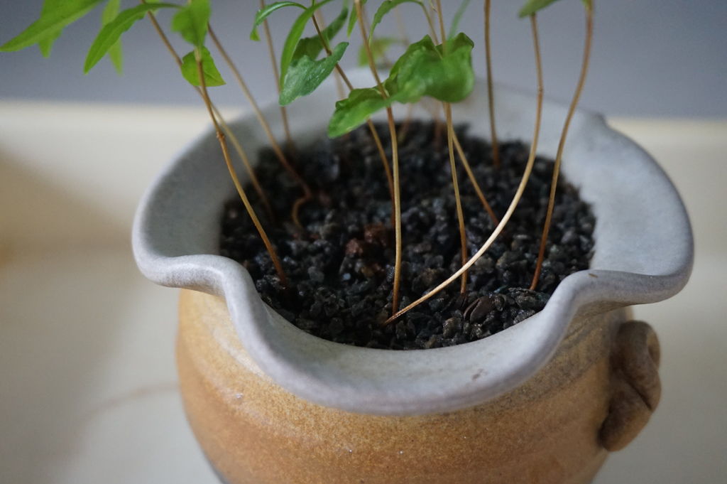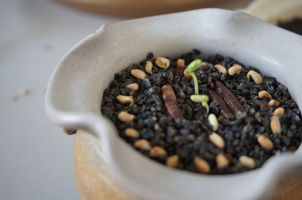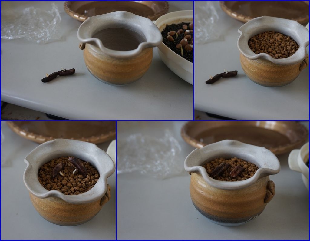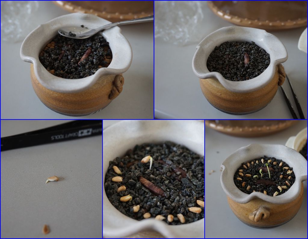 看到石榴及椰棗發芽的種子,於是找了一個陶盆,將這2樣種子一起合植,打算種一盆"種子組合盆栽"。