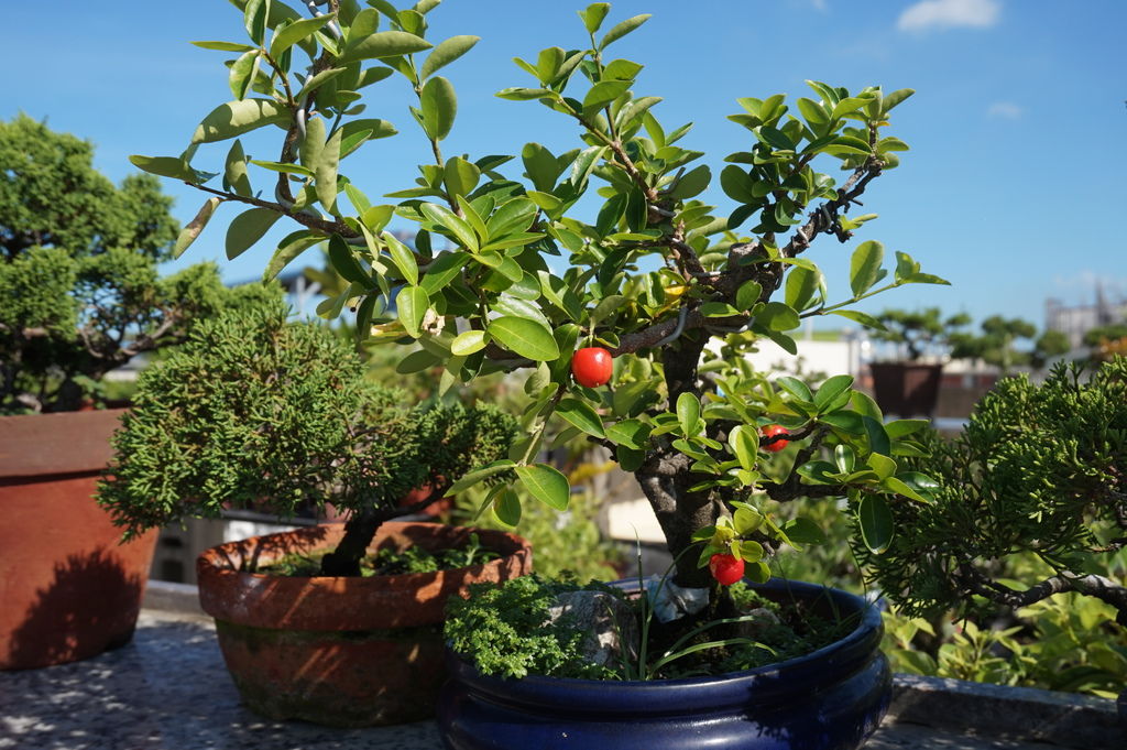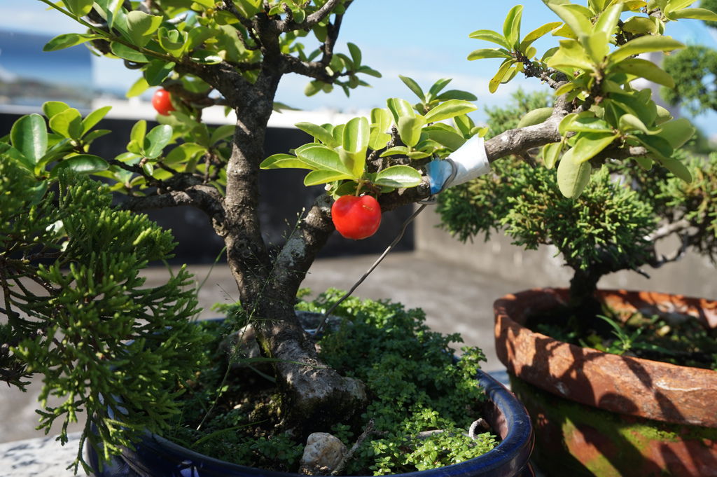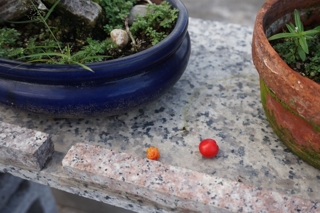 在頂樓種果樹盆栽,所結的果實最怕就是被小鳥偷吃,果實沒有成熟紅通通,小鳥還不吃,紅了,可能一下子就沒了,我發現這3顆小櫻桃的時候,已經有一顆已經被小鳥吃了一口了~