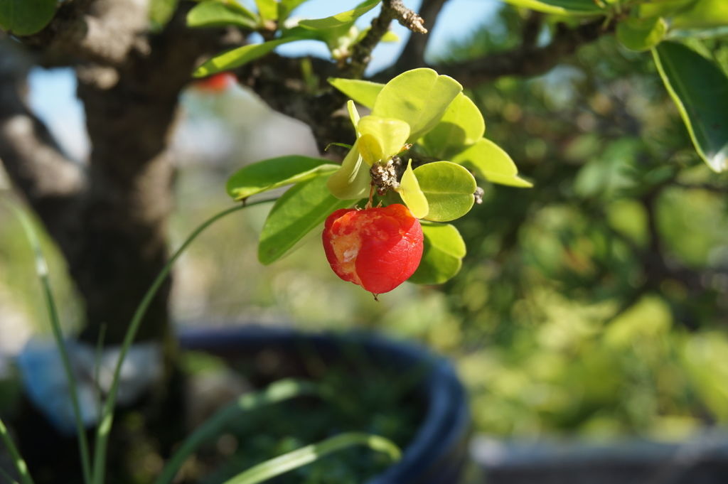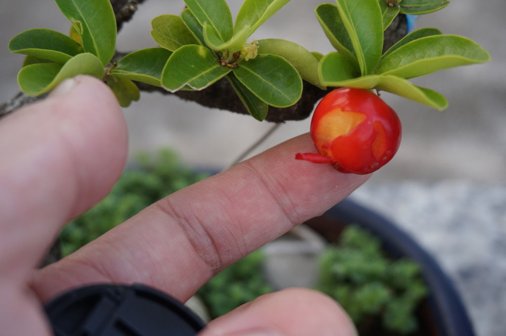 這盆西印度櫻桃盆栽是在2015年購買的,至今所結的果實,用手指就可以數出來了,可見它結果率不高,今年的1月份,我才用高壓繁殖法,成功繁殖另一棵,希望也能開花結比較多果實。