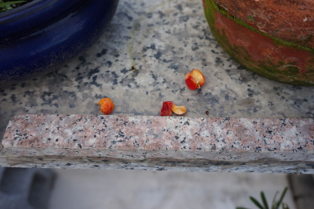 原本想樹上的小櫻桃只被啄一小口而己,但數一數~哇,其它2顆不見了,一顆掉在盆子裡面,另一顆掉在地上,而且已經被小鳥吃到只剩下種子而己。