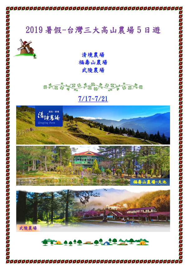 今年(2019)暑假安排全家旅遊~台灣三大高山農場5日遊,這個計劃早2個月前就已經在訂房,安排路線及景點,這回選的高山農場~清境農場、福壽山農場及武陵農場,都是高海拔的農場,現在夏天到山上剛剛好,溫度也不會太冷,白天很涼爽。我們計劃第1天到清境農場,住清境國民賓館,第2天到福壽山農場,也住在福壽山農場裡,第3及第4天在武陵農場,住武陵國民賓館2天,慢遊在山林裡。