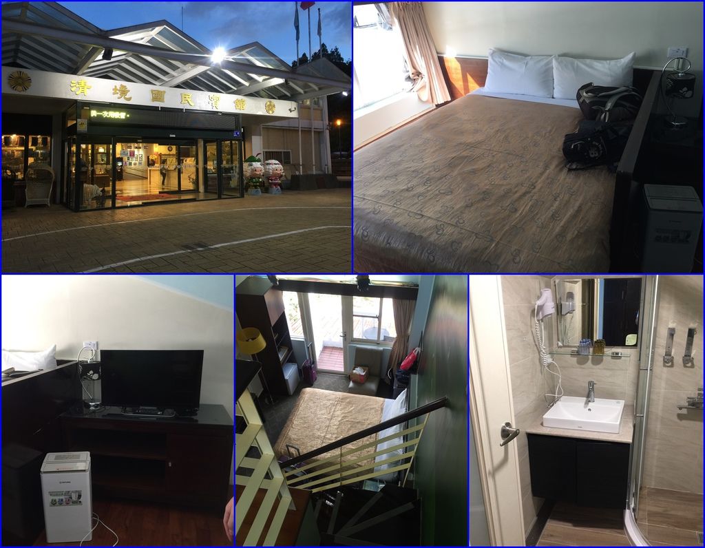 我們住的清境國民賓館,原來訂的是"閣樓4人房",但進入房間後,發現很悶熱(這天天氣很好,太陽又滿大的),沒有冷氣,只有電風扇,其實高山農場的住宿都是沒有冷氣的,但這天白天就很熱,於是打開陽台窗戶,哇~好多油煙味,原來我們住的這整排閣樓式4人房,都是在餐廳的上面,又剛好廚房在煮東西,以所味道很不好聞,於是向櫃台反應,還好給我們換房(可能颱風有人退房吧~哈),換到比較後面一點的4人房,是雙床的,但一樣沒有冷氣,還好晚一點,氣溫就下降了,有點涼意,就還好,真的沒住過不知道,也還好有換房間,不然我們可能都要聞那油油的油煙味了。