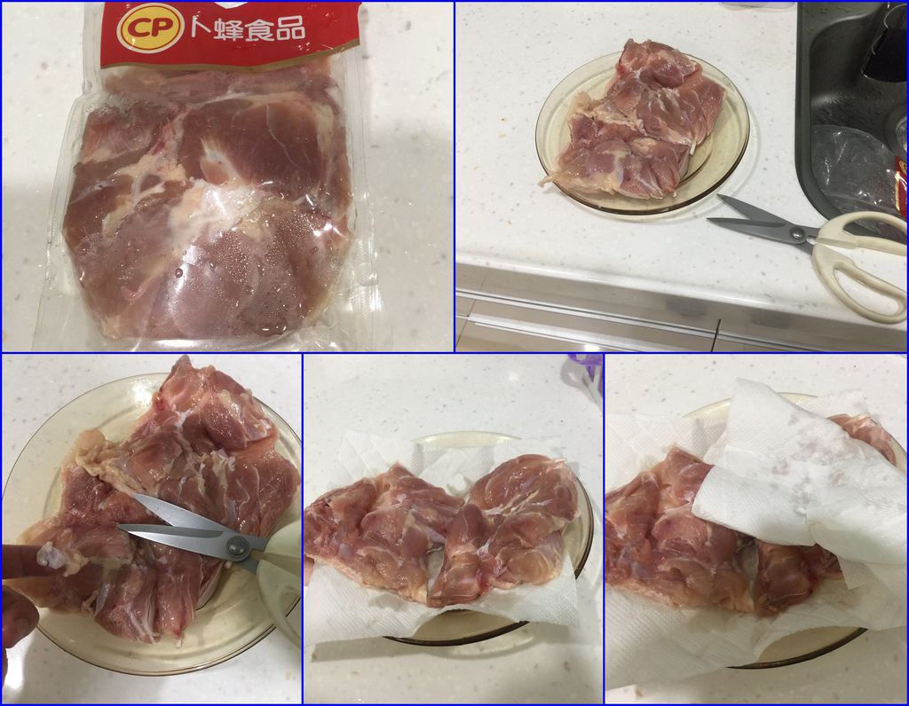 去骨雞腿排~是冷凍的,解凍後沖洗一下,我都會使用剪刀,把看得見的黃色油脂剪掉,因為我們不太喜歡太油的雞腿排,剪完後,洗一下,再使用廚房紙巾吸一下雞肉上面的水,水太多,下鍋煎時,容易噴油水。