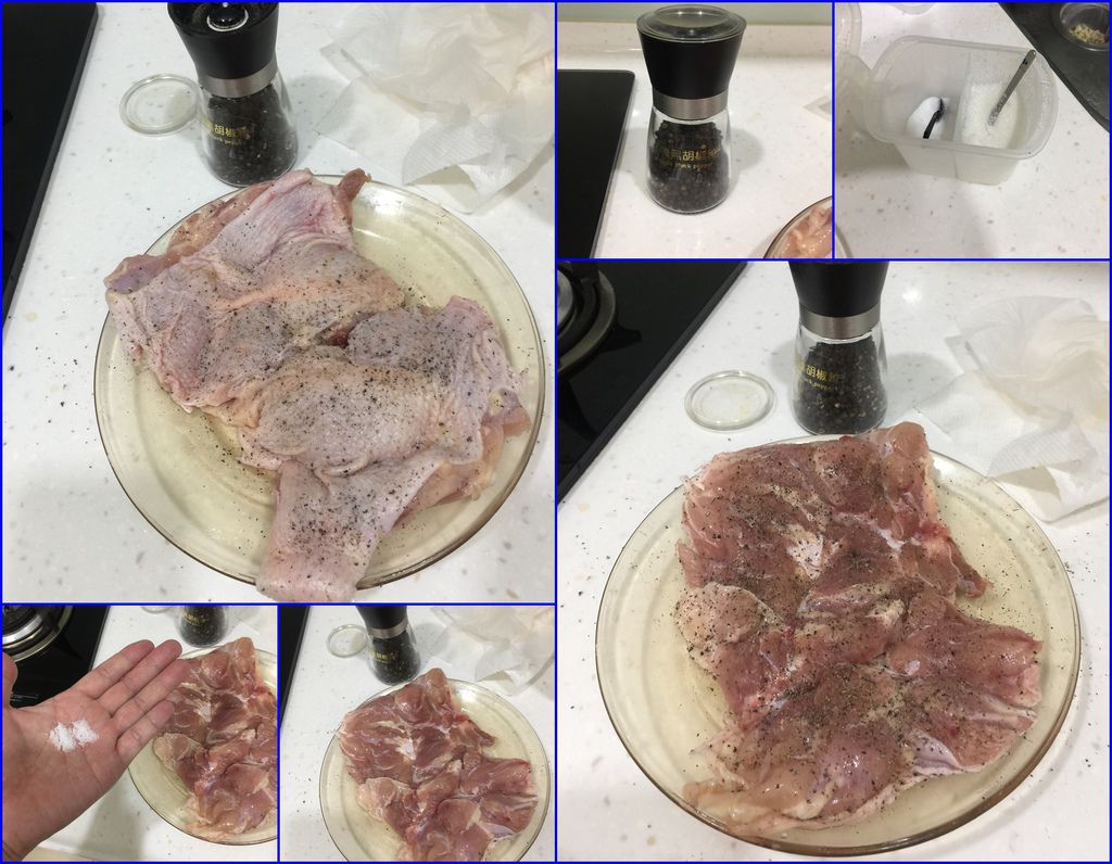 ▼撒一些鹽及黑胡椒(皮那一面少一些,肉那一面多一些)