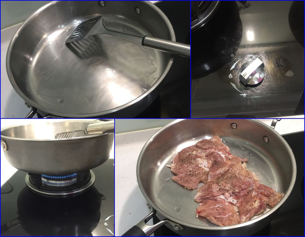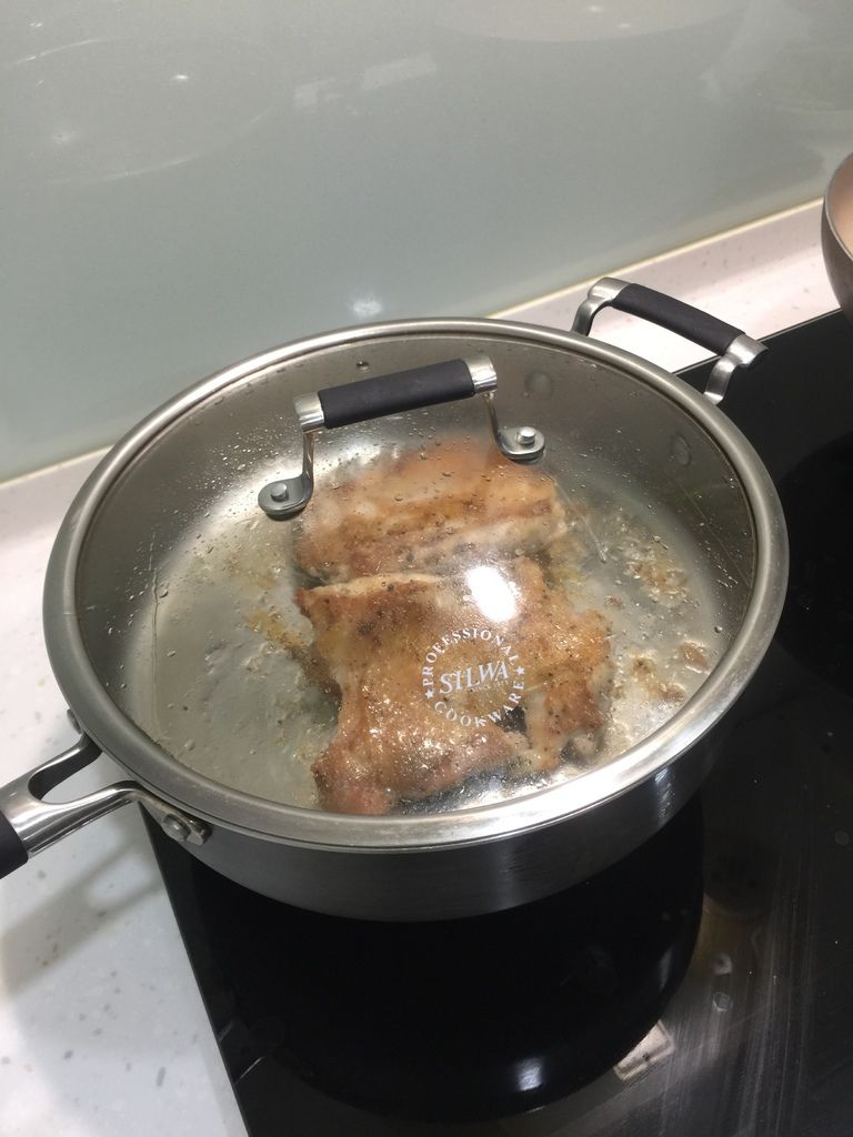 油平均塗在平底鍋內,以中小火煎,這裡有重點,要記得"冷鍋擺入雞腿排",鍋子太熱,放入肉的時候,容易噴油,有噴到手的風險,也可以先不開火,等雞腿排擺好,蓋上蓋子,再開火~開始煎。