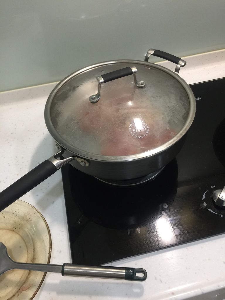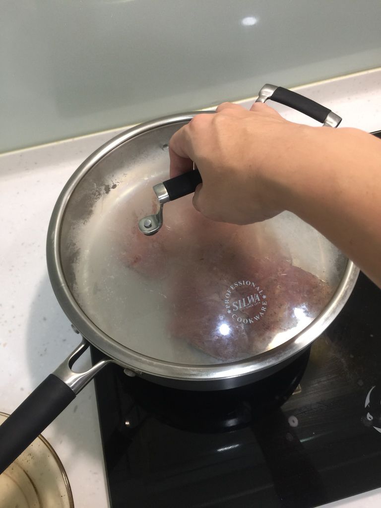 ▼開中小火繼續煎肉這一面(四分鐘+一分鐘)開火4分鐘後關火等1分鐘
