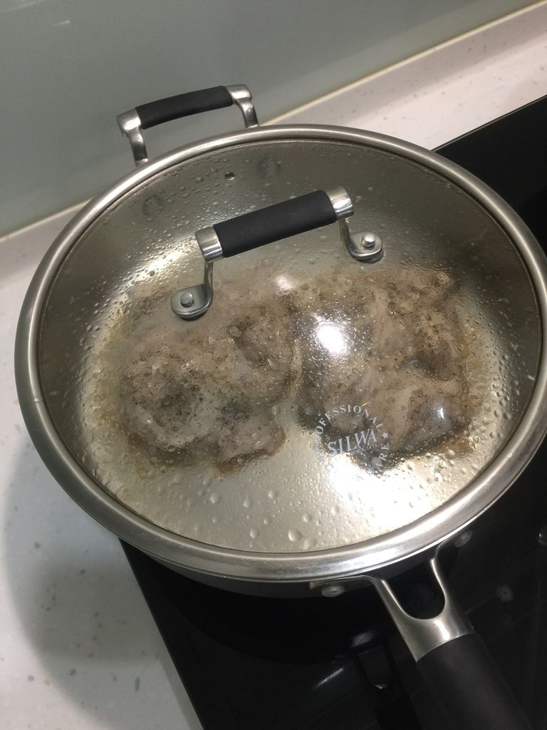 ▼皮這一面煎好了~關火等1分鐘後,不會噴油時,再打開蓋子再翻面