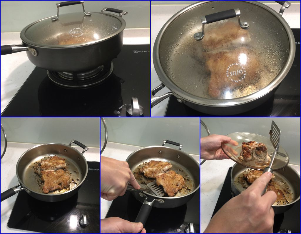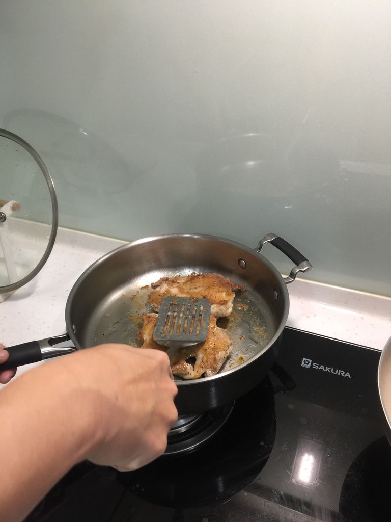 煎雞腿排~很怕就是油煙噴的到處都是,我們也不喜歡廚房油膩膩,所以在煎的時候,一定把蓋子蓋好,時間到先關火,等1分鐘,等比較不會噴油時,再打開蓋子,翻雞腿肉時,也比較不會噴油噴到手,這個方法很不錯吧。