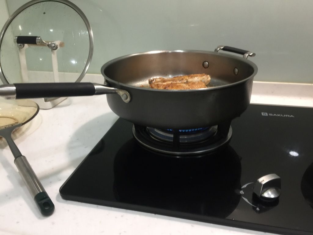 ▼開始煎了~平底鍋加少許油,少少油就可以,雞皮本身就有油脂,煎的時候會有油出來