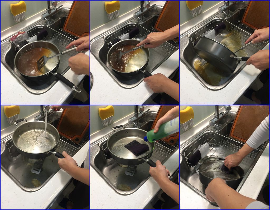 注意~用熱水洗鍋,也要注意不要被燙到,熱水+髒水~要先倒掉,再加一些冷水,再加一些洗潔精,再用菜瓜布刷,如果鍋子太熱,可以再加一些冷水降溫,廚房最怕就是燙傷或刀傷,還是要小心點好。