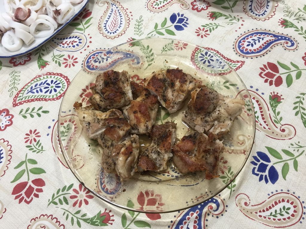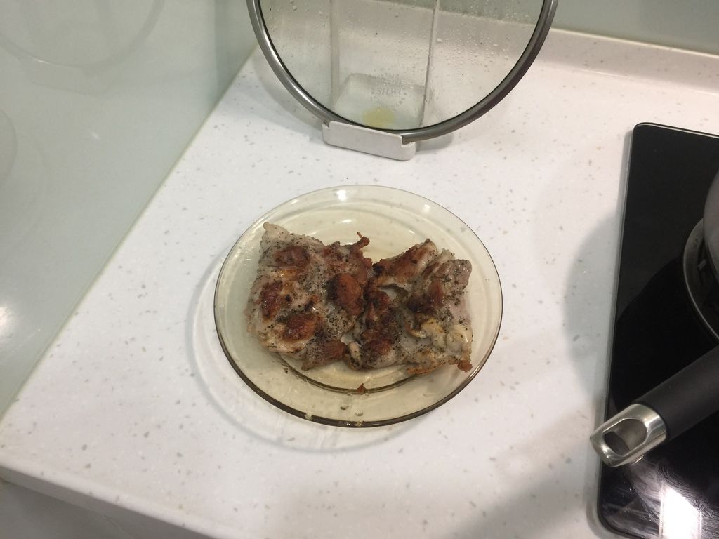 香煎雞腿排,只是簡單的撒一些鹽及黑胡椒,因為我們不吃皮,所以皮那一面只撒了一些,肉那一面多一些,這樣煎起來剛剛好。