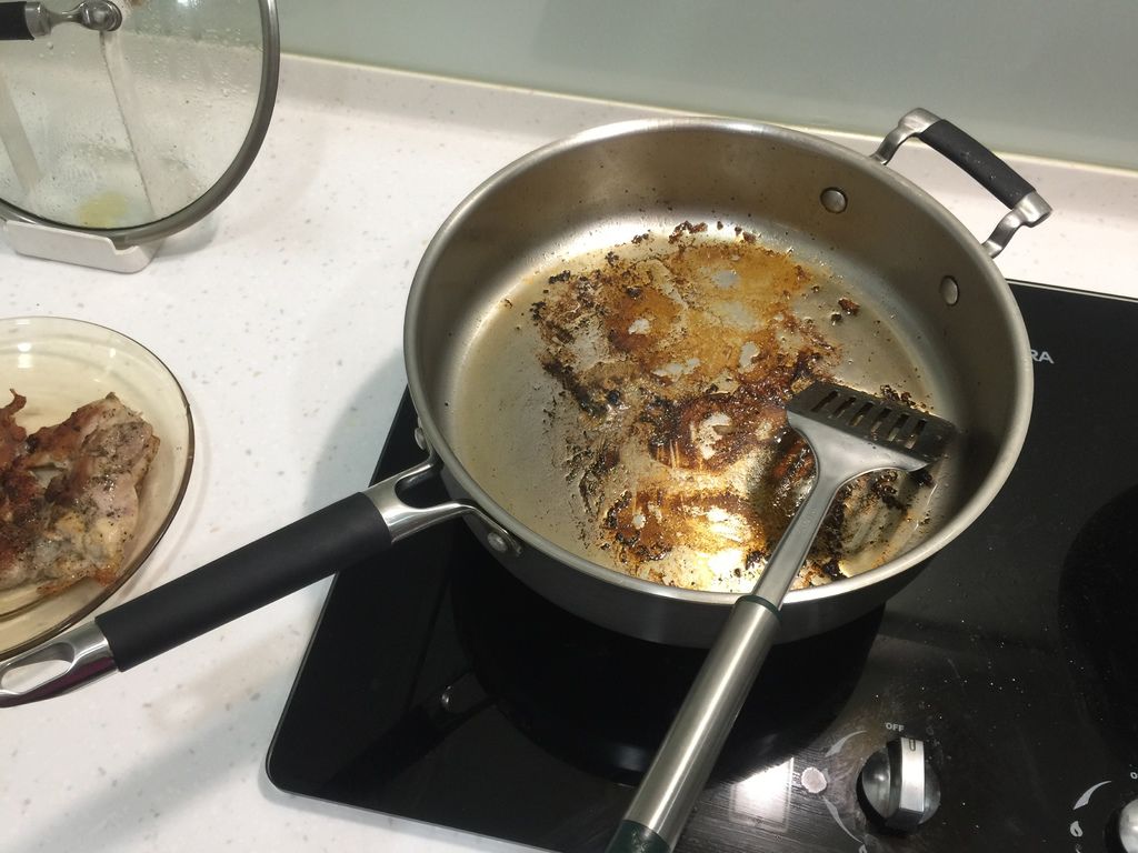 ▼不銹鋼平底鍋~用菜瓜布用力刷也沒問題(其實用熱水洗,不需要很不力,也可以輕易洗乾淨)