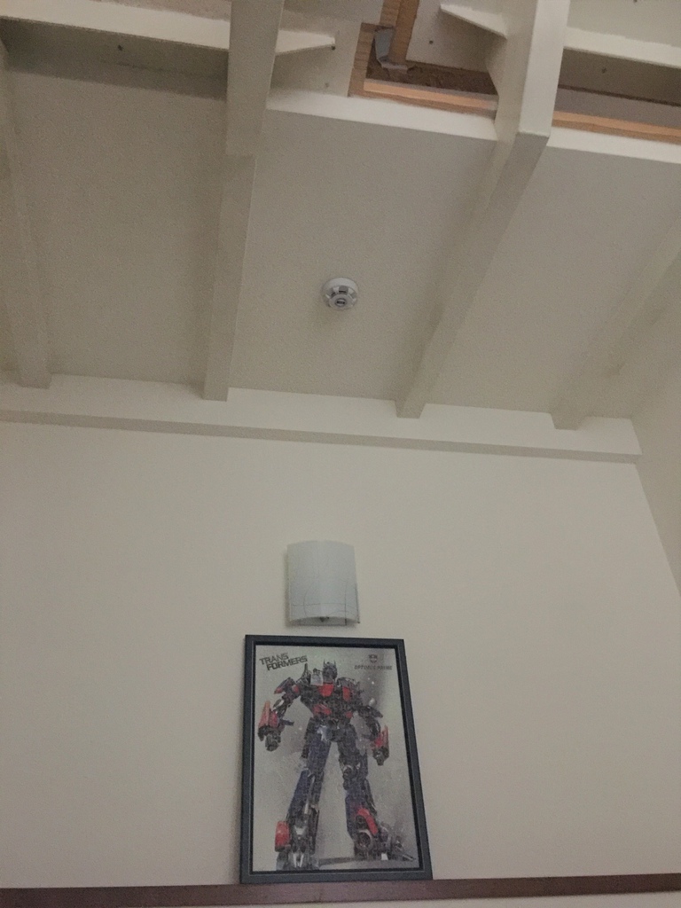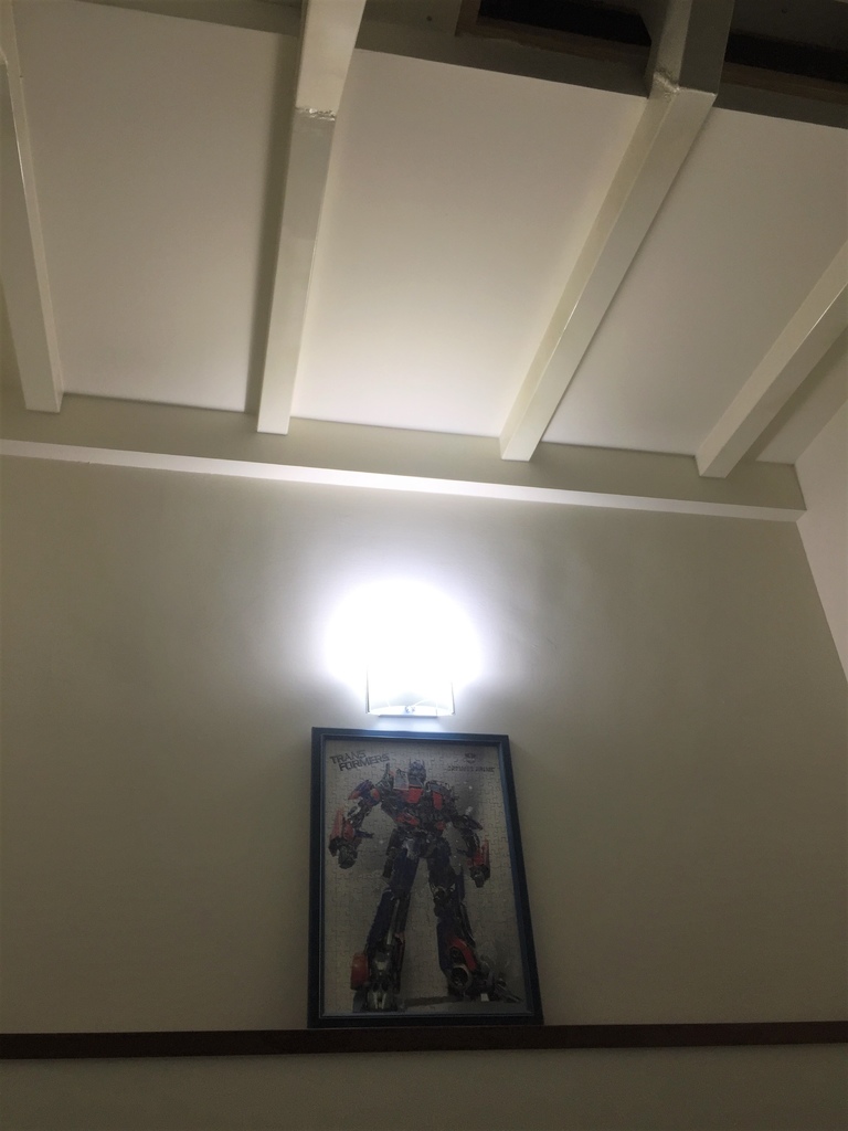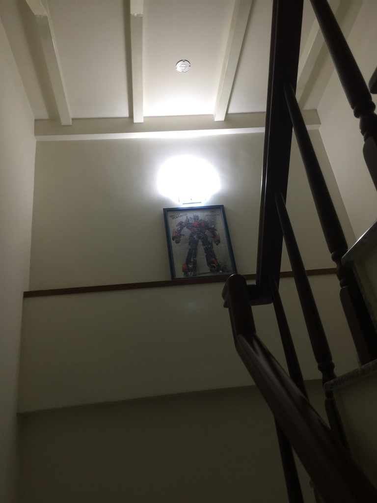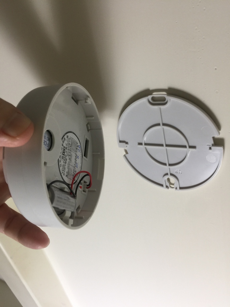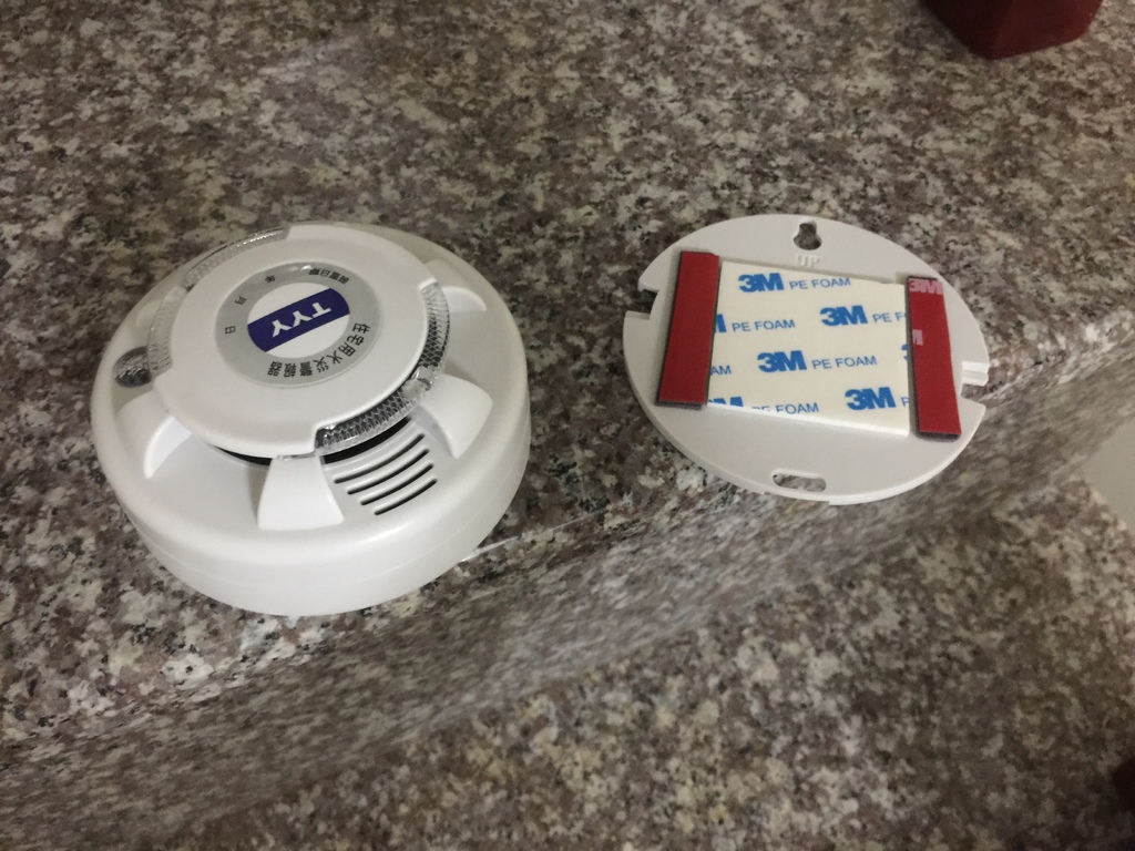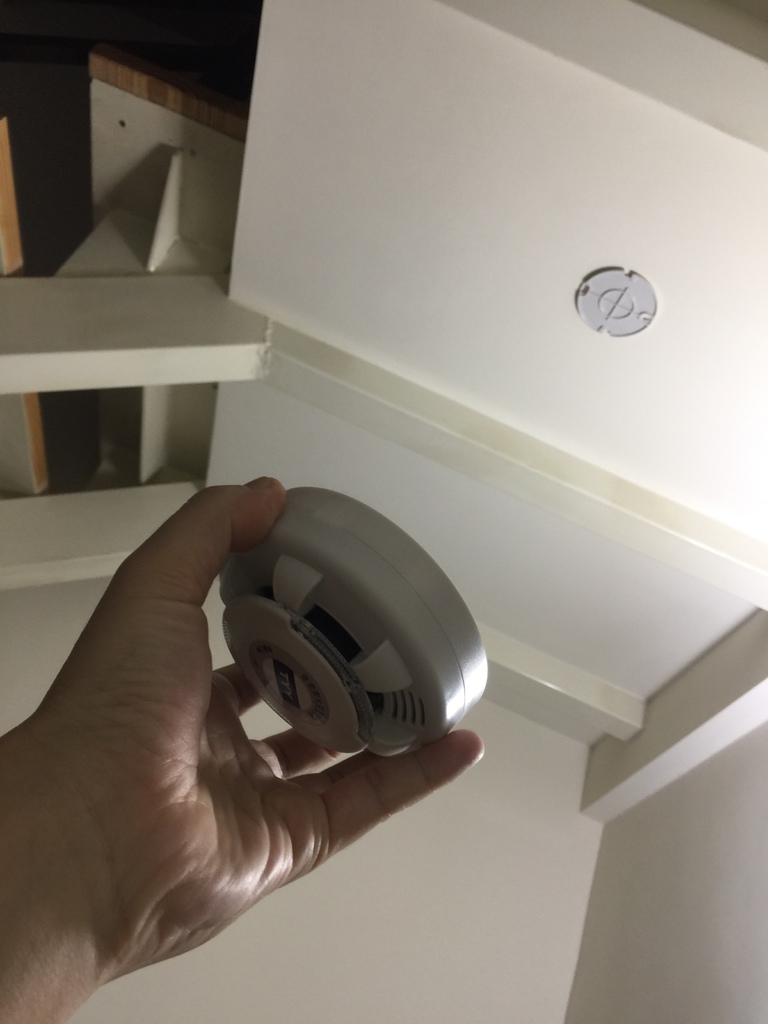 安裝這火災警報器,其實不會很難,重點在於要掛上去的地方,是木板、鐵皮或水泥,方法不太一樣,木板可以用螺絲鎖上去,鐵皮可以用雙面膠,水泥可能要看會不會有粉粒,水泥用雙面膠,有可能黏不住,但可以試看看。這回裝在樓梯轉角,如果有煙,煙一定會往上跑,所以個位置應該是可以的。